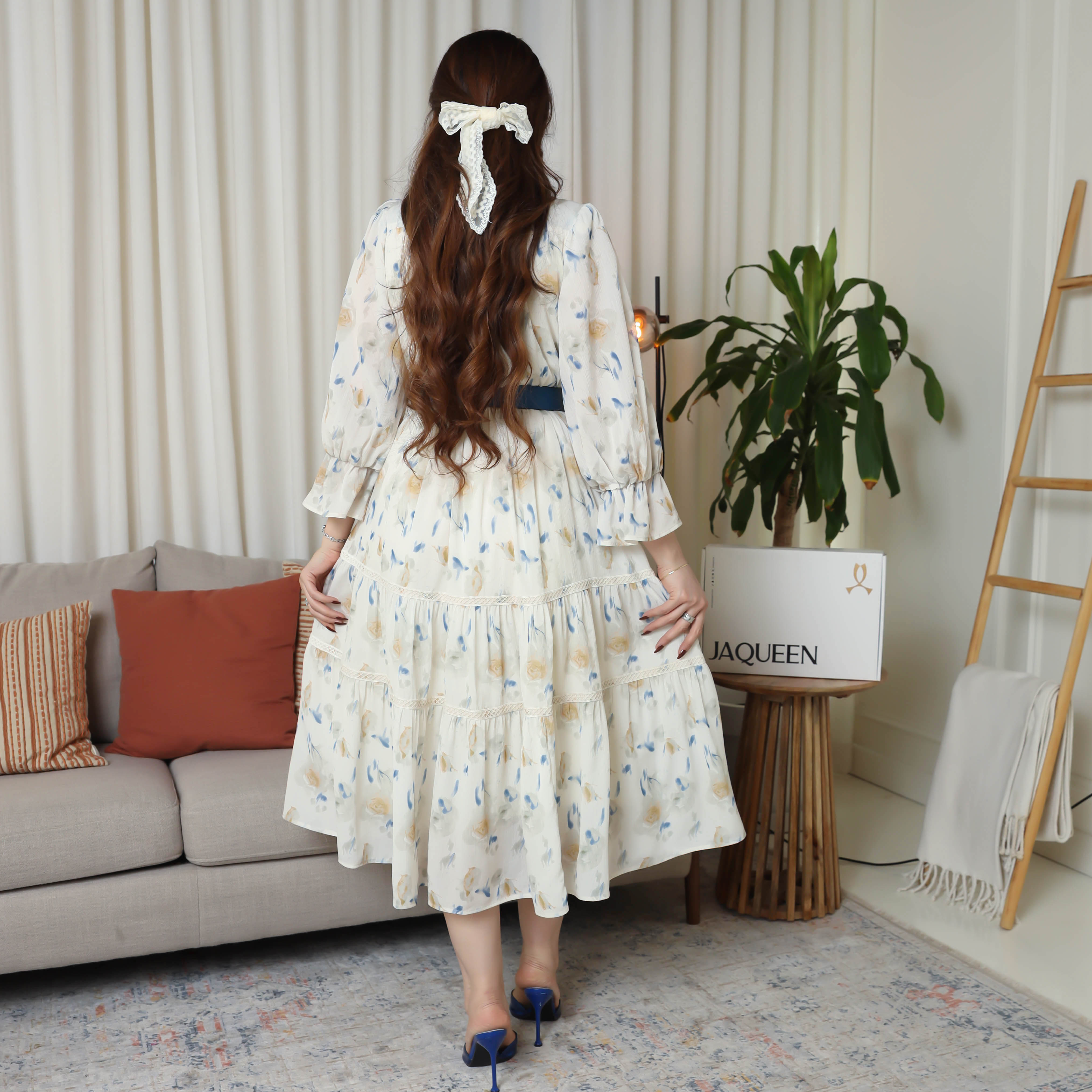 دللي نفسك بإطلالة مفعمة بالحيوية والأنوثة مع فستان مشجر ميدي كم طويل من جاكوين. صُمم من شيفون ثقيل عالي الجودة يمنحك انسيابية ناعمة وشعوراً بالراحة طوال اليوم، مع نقشة ورود عصرية تضيف لمسة حيوية إلى مظهرك. الحزام الأزرق على الخصر يبرز القوام بشكل أنثوي راقٍ، ليمنحك حضوراً أنيقاً سواء في الطلعات الصباحية أو جلسات التصوير الربيعية. متوفر بمقاسات من S حتى XL ليناسب جميع الأجسام ويمنحك ثقة في إطلالتك مع كل تفصيلة. تصميمه يجمع بين البساطة والفخامة، لتشعري بالأنوثة والراحة في آنٍ واحد. جاكوين، العلامة التي تقدم فساتين سهرة ناعمة وراقية تعكس القوة والأنوثة مع لمسة ملكية، تقدم لك هذا التصميم لتجعلي منه خيارك المثالي لكل مناسبة يومية أو خاصة.