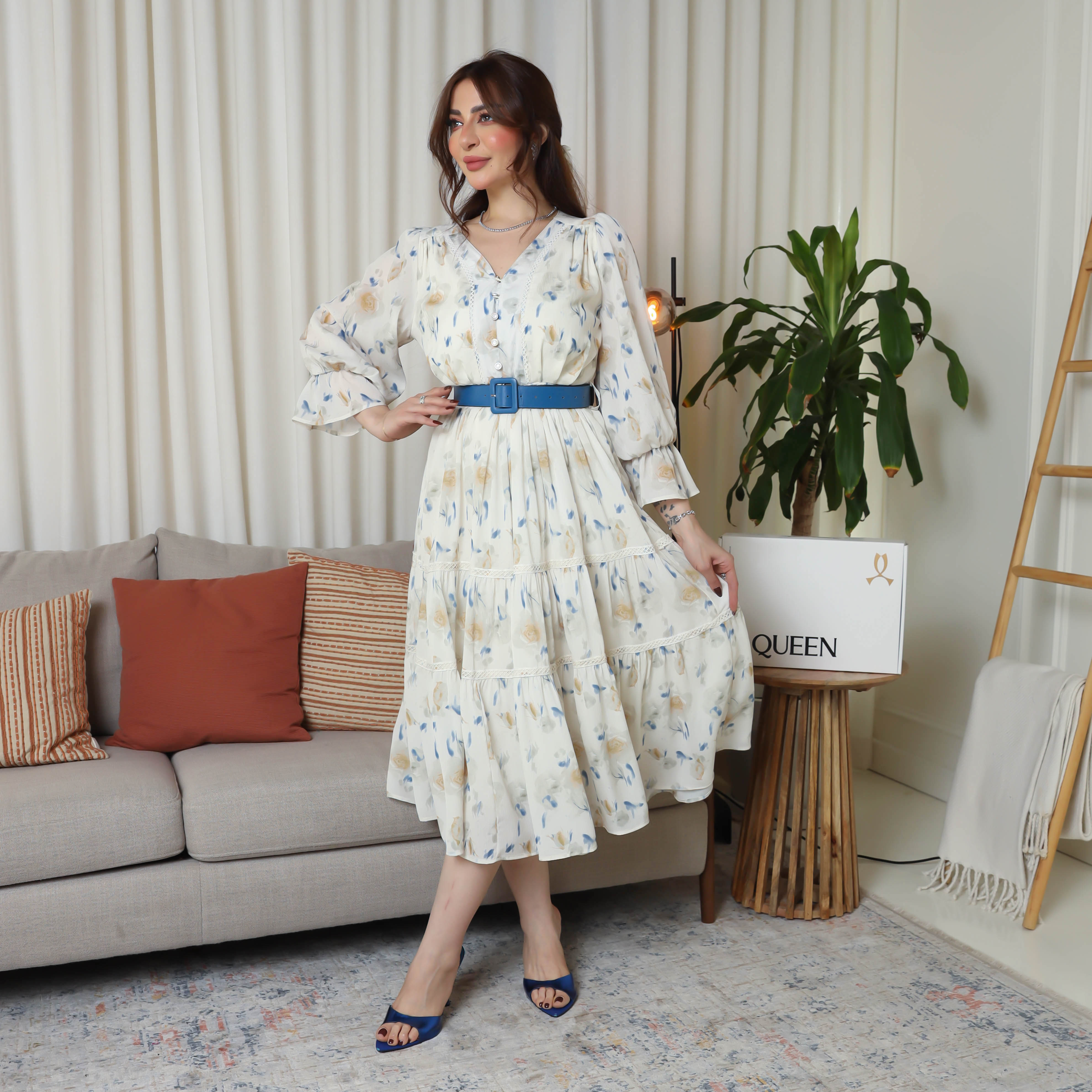 - مميزات التصميم : نقشة ورود عصرية, حزام أزرق على الخصر, أكمام طويلة .