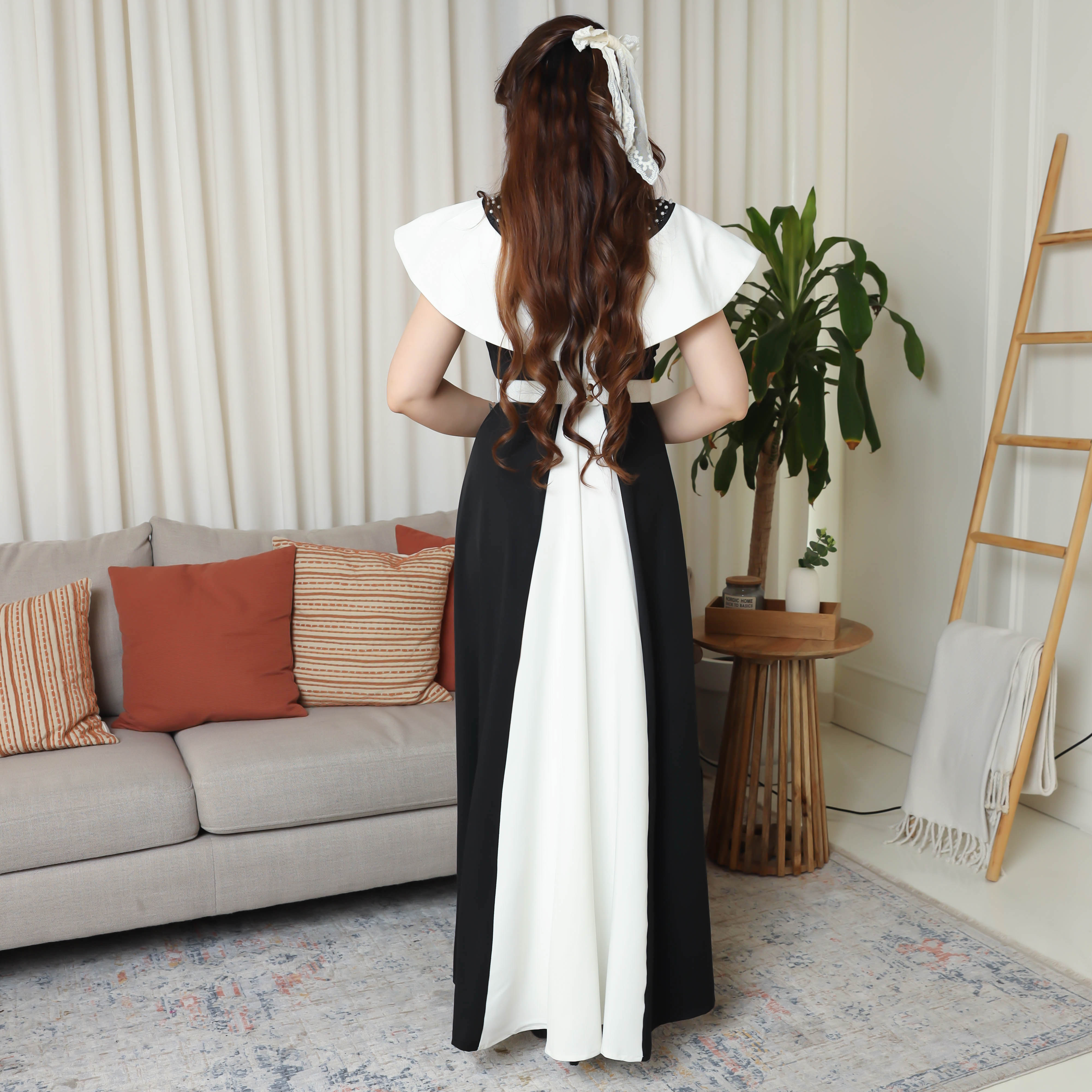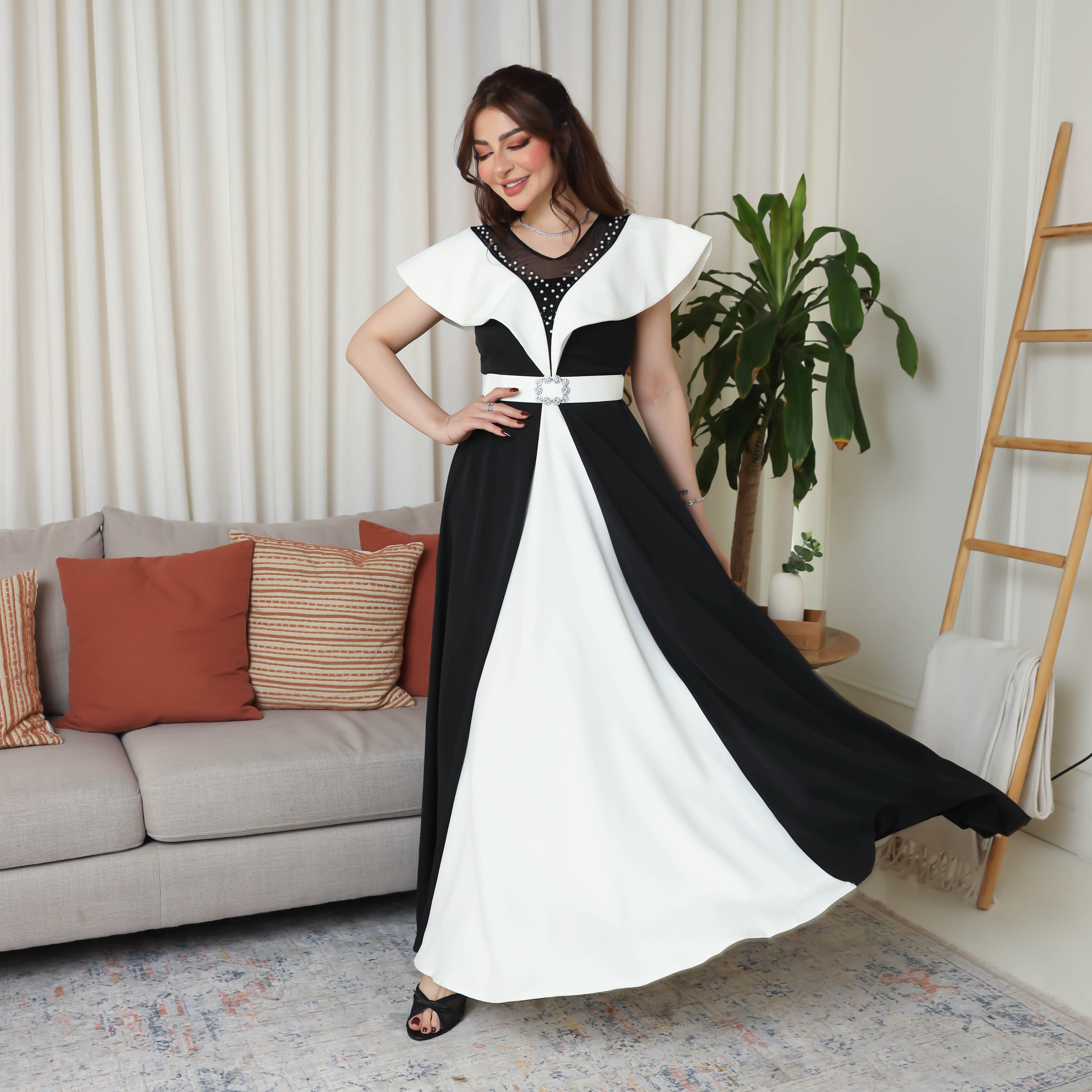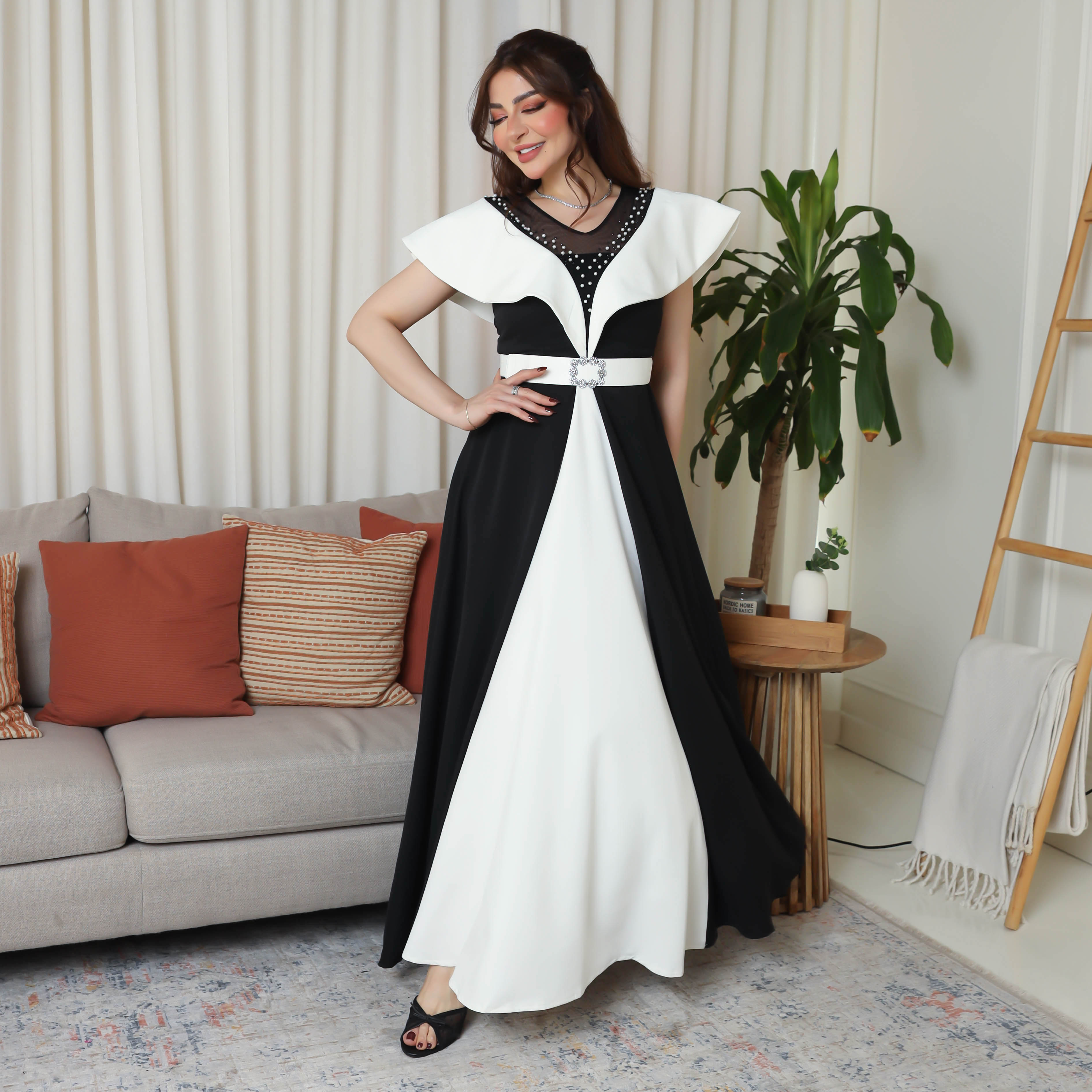 💫🌸 فستان أسود ناعم بتفاصيل فاخرة ولمسة بيضاء أنيقة لإطلالة ملكية 🌸💫