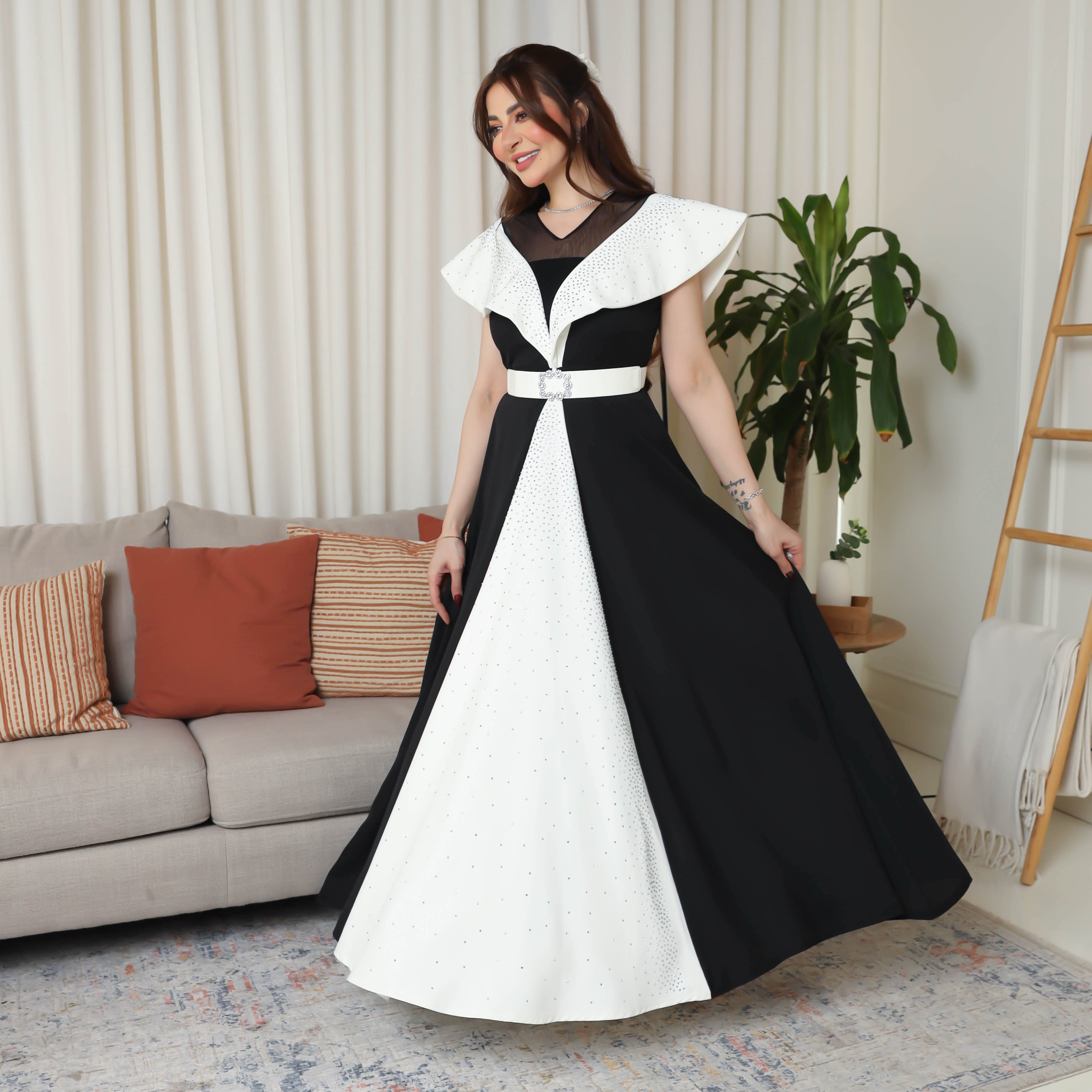 💫🌸 فستان أسود ناعم بتفاصيل فاخرة ولمسة بيضاء أنيقة لإطلالة ملكية 🌸💫