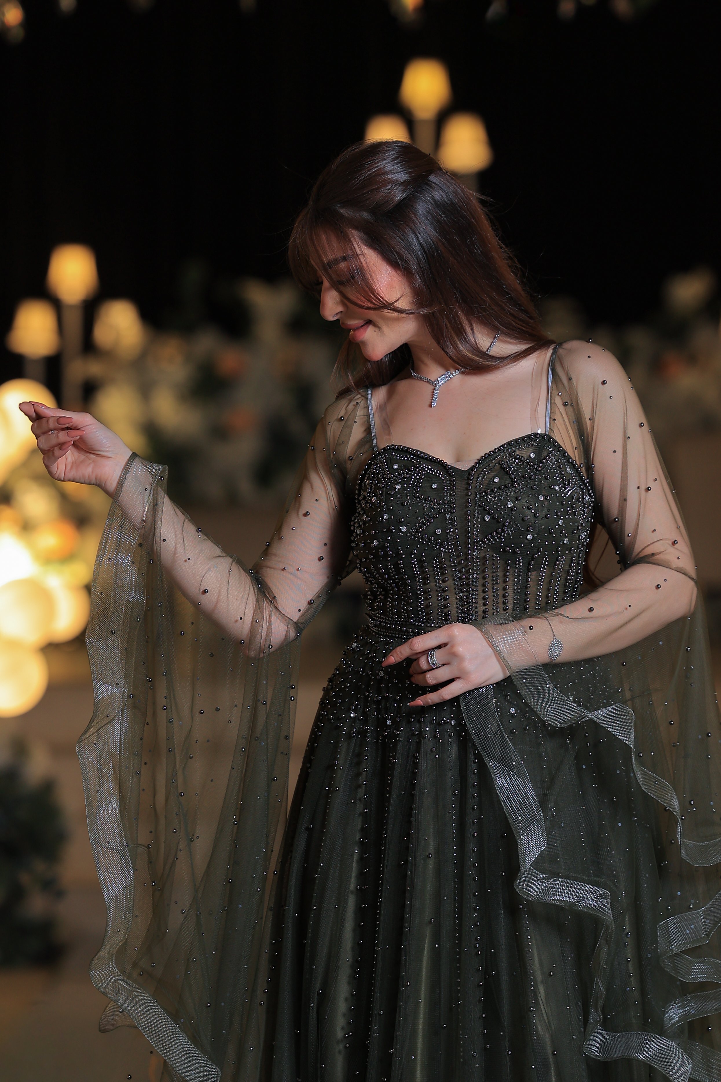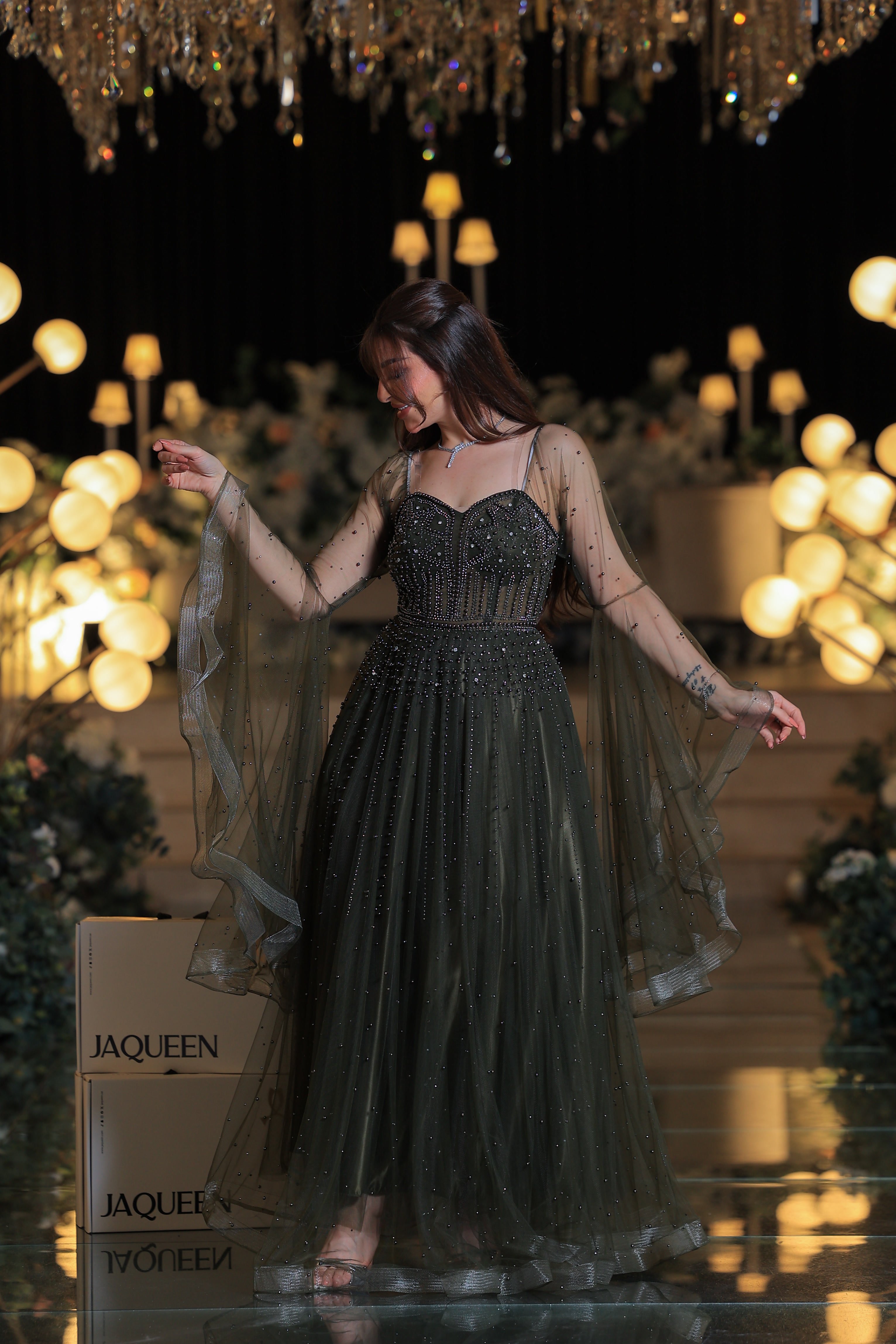 اختبري الفخامة بكل تفاصيلها مع هذا الفستان الراقي من جاكوين، المصمم ليمنحك حضورًا لا يُنسى في كل مناسبة خاصة . يتميز الفستان بتطريز فاخر بكريستالات دقيقة تتلألأ مع كل حركة، ما يضفي تأثيرًا ملكيًا ساحرًا يخطف الأنظار . تأتي الأكمام الطويلة الشفافة من قماش التول المطرز لتضيف لمسة من الرقي والنعومة ، بينما يحدد تصميم الخصر المنحوت جمال القوام ويُبرز الأنوثة بأقصى درجاتها . التنورة الواسعة المنسدلة بانسيابية تمنحك حرية الحركة وإطلالة مهيبة تشع بالثقة والجاذبية ، مما يجعل هذا الفستان الخيار المثالي لحفلات الخطوبة، المناسبات الرسمية ، وجلسات التصوير الرمزية. مع كل خطوة ، ستشعرين أنك تجسدين المعنى الحقيقي للأناقة الراقية التي لا تُنسى .