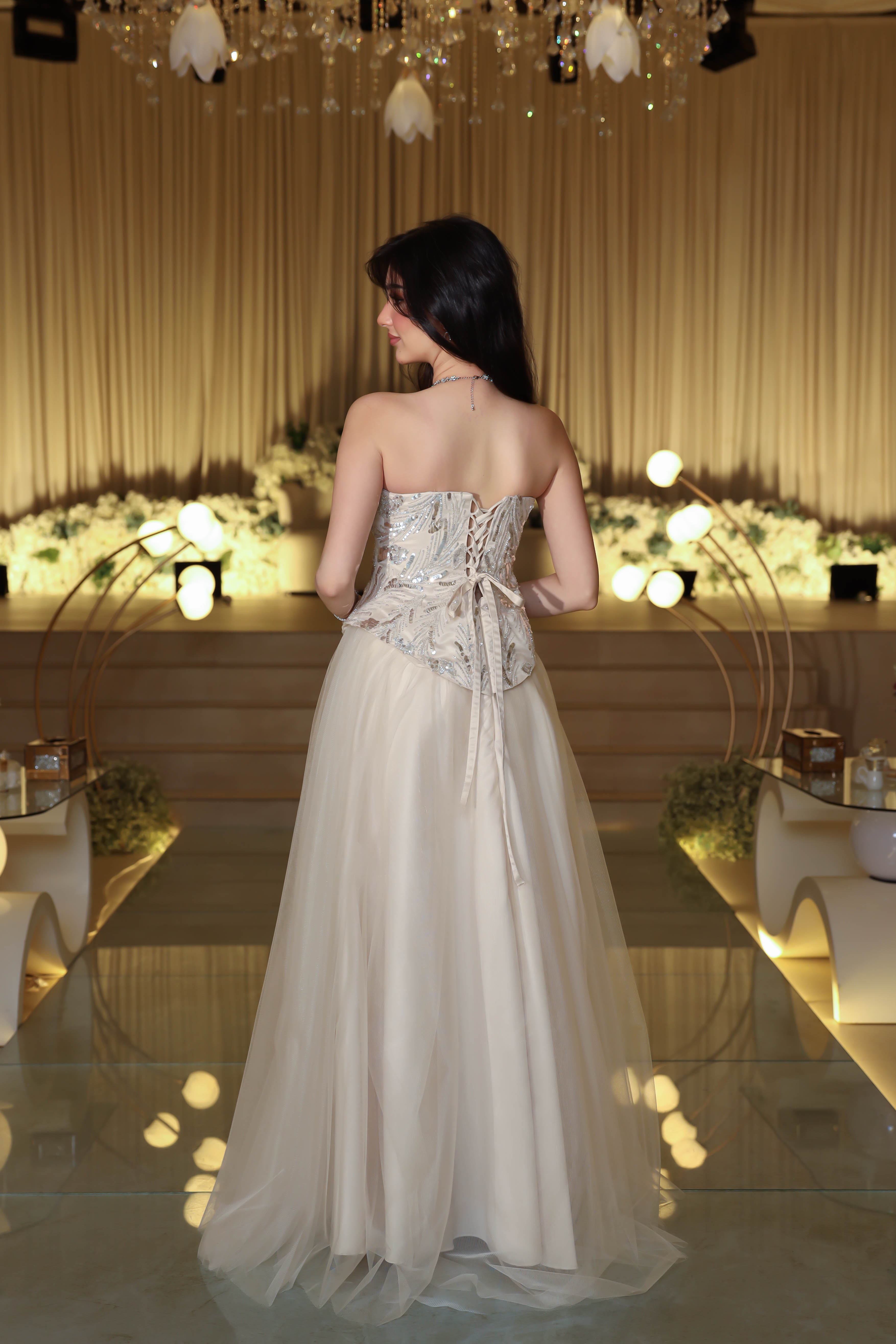 - مميزات التصميم : تطريز فاخر لامع على الصدر بلمسة ملكية , قصة سترابلس بقصة قلب تُبرز جمال الجزء العلوي .