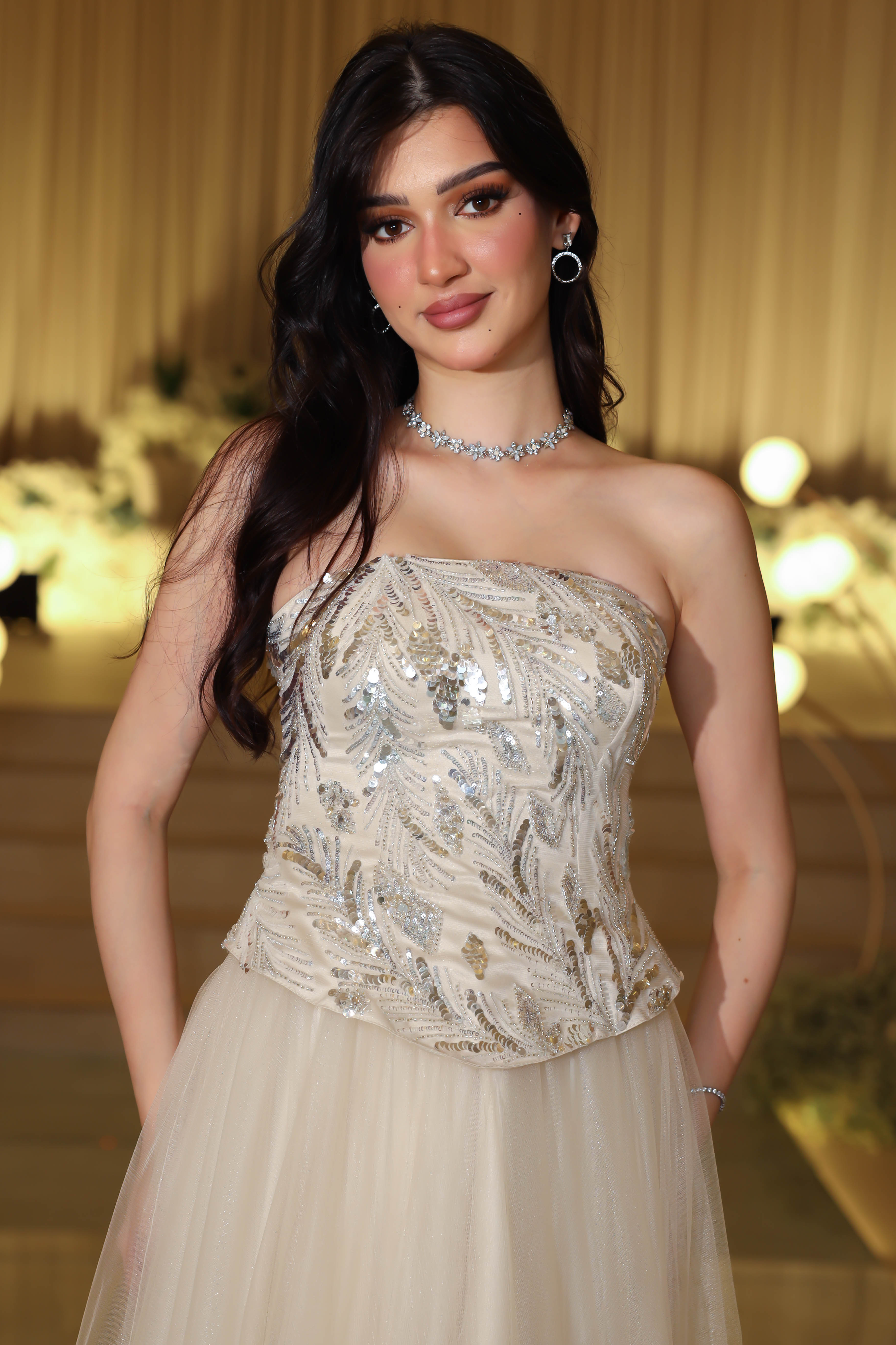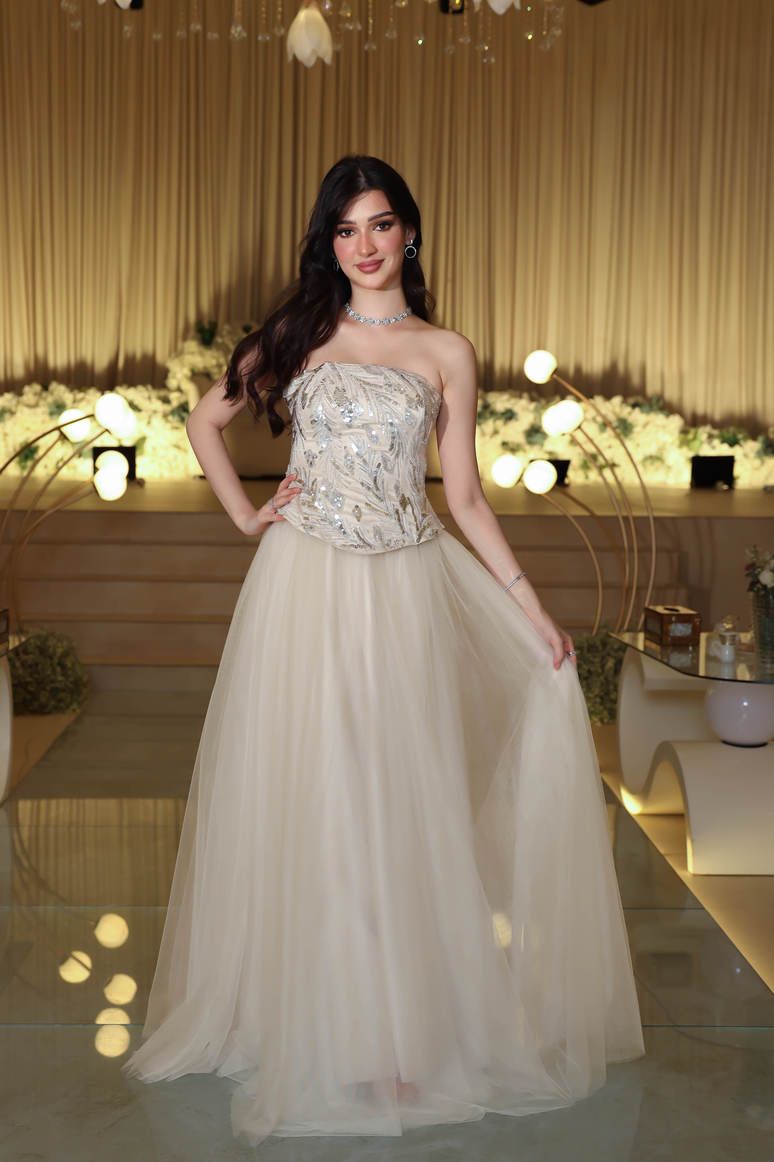استعدي لتألّق يليق بالأميرات مع فستان جاكوين المنفوش بتصميمه الفاخر الذي يجمع بين الرومانسية والفخامة. صُنع من قماش تايواني فاخر يمنح الفستان انسيابية مثالية وبريقًا راقيًا تحت الأضواء، ليكون خيارك الأمثل لإطلالة تُعبّر عن الأنوثة الملكية. يتميّز الفستان بتطريز فاخر على الصدر يلمع مع كل حركة، وقصة سترابلس بتصميم على شكل قلب تُبرز جمال الجزء العلوي وتضفي جاذبية أنثوية آسرة. تصميمه المنفوش يمنح القوام توازنًا ملكيًا، لتبدين وكأنك تخطين على منصة من الضوء. بفضل تفاصيله الدقيقة وخاماته الفاخرة، يمنحك إحساسًا بالثقة والتفرّد في كل لحظة.