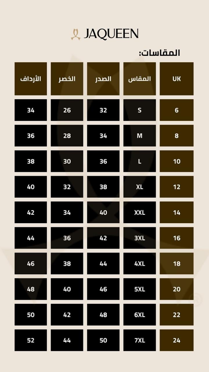 - المقاسات : ["6", "8", "10", "12", "14", "16"] .