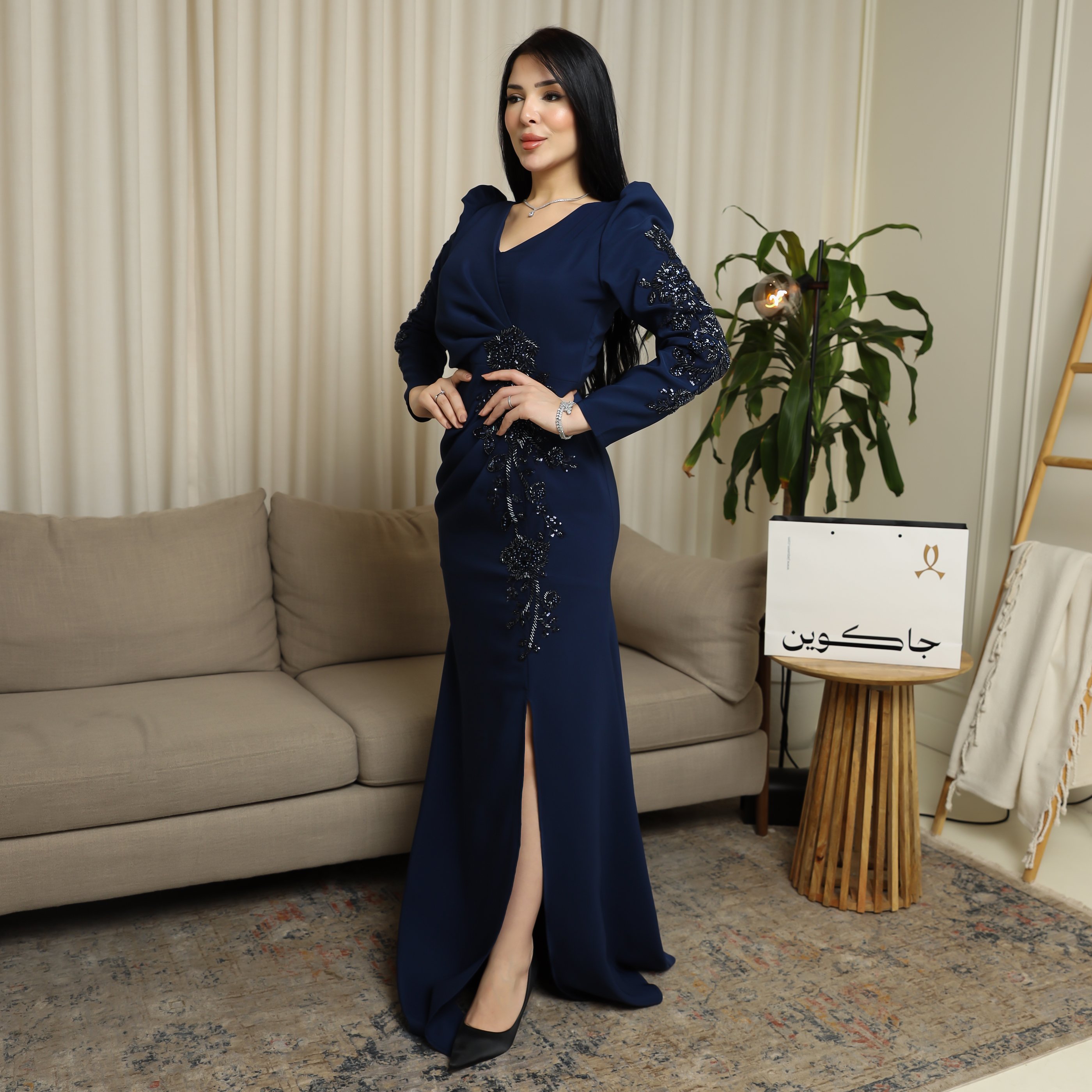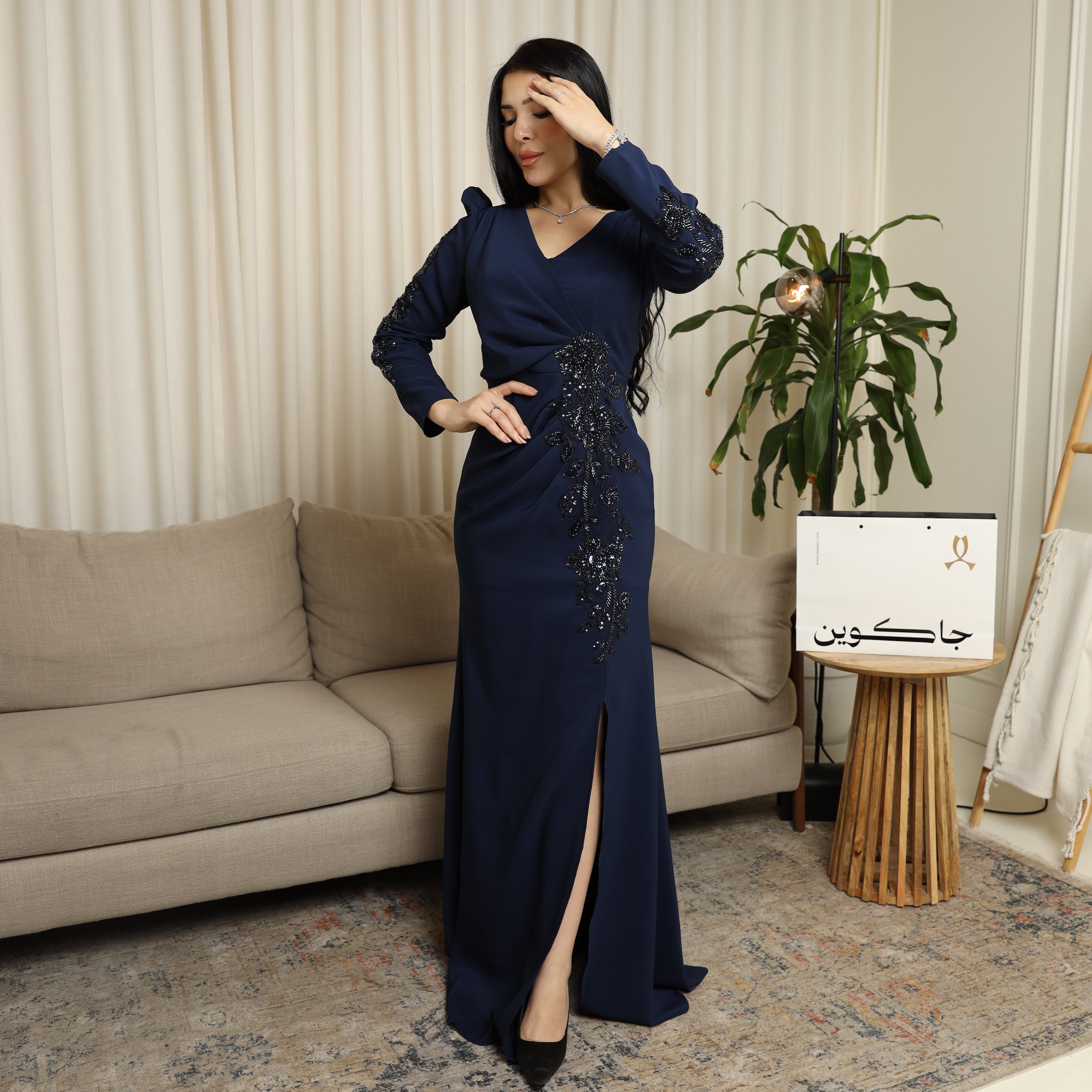 - مميزات التصميم : لون كحلي ملكي فاخر, تطريز متقن على الأكمام والخصر, أكمام طويلة مع أكتاف بارزة, فتحة جانبية أنيقة للحركة والجاذبية, قصة انسيابية تبرز الخصر وتطيل القوام .