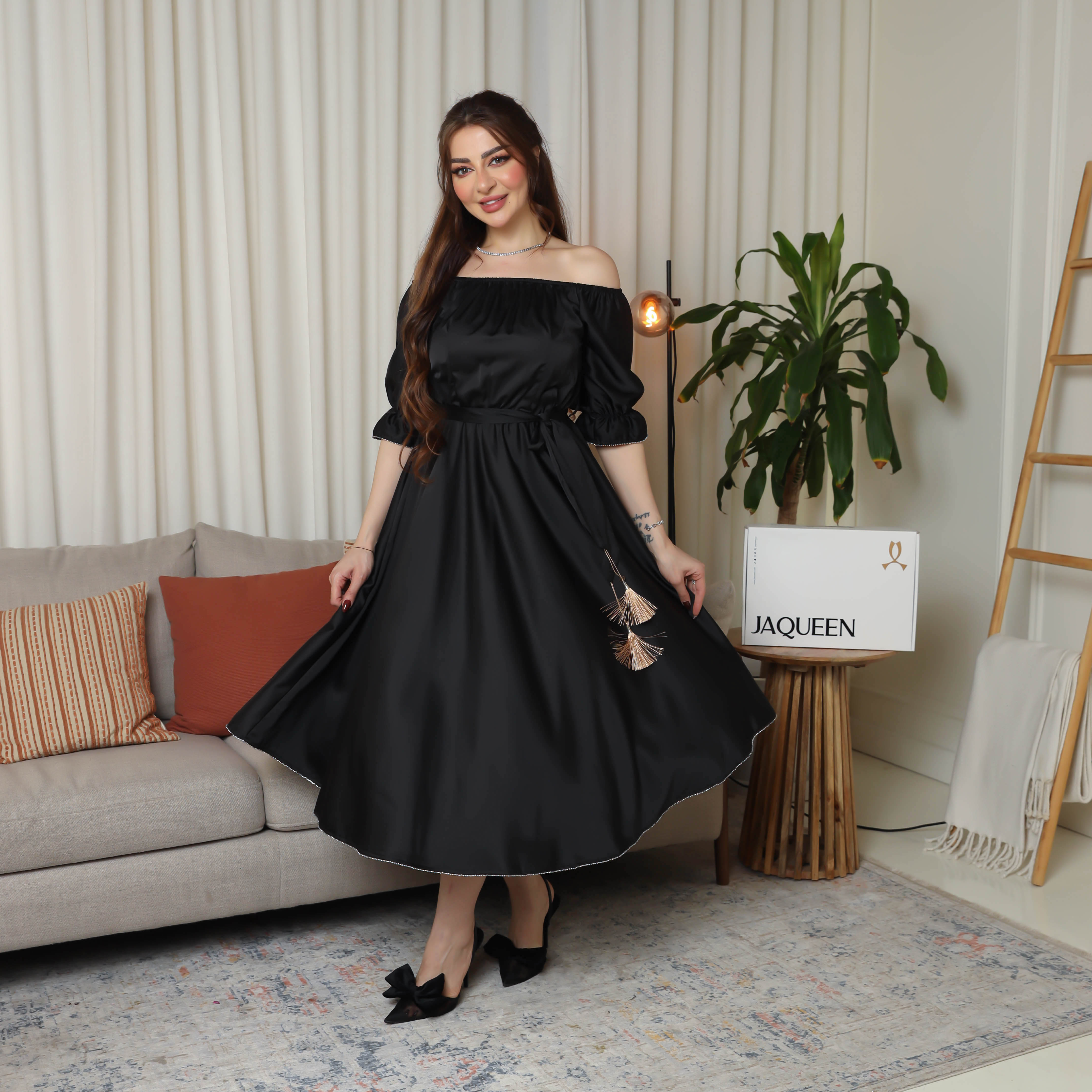 اختاري التميز مع فستان أوف شولدر باللون الأسود من جاكوين، قطعة راقية تجمع بين الأنوثة والقوة مع لمسة ملكية. صُمم من قماش الساتان الناعم المعروف بلمعته الفاخرة التي تضيف بريقًا متألقًا تحت الأضواء، ليمنحك إطلالة مفعمة بالثقة والجاذبية.\n\nيتميّز الفستان بقصة أوف شولدر تكشف الأكتاف برقي، مع حزام أنيق يحدد الخصر ليبرز جمال القوام بأسلوب أنثوي ناعم. متوفر بمقاسات من S حتى XL ليلائم مختلف الأجسام ويمنحك راحة وانسيابية. ارتداؤه يجعلك تشعرين وكأنك أيقونة أنثوية تنبض بالثقة والجمال. إذا كنتِ تبحثين عن فساتين سهرة ناعمة تعكس فخامة ذوقك وتمنحك إطلالة ملكية.