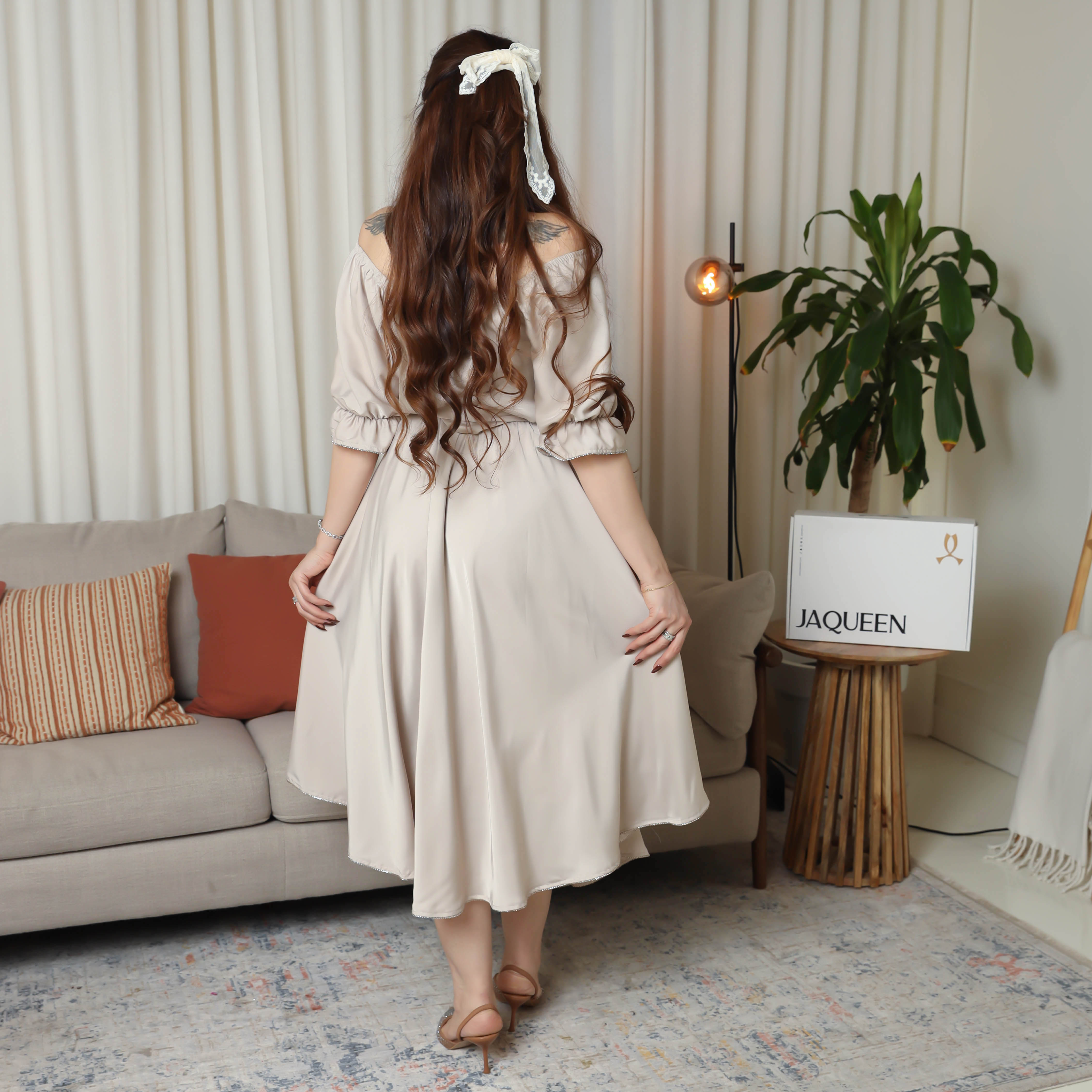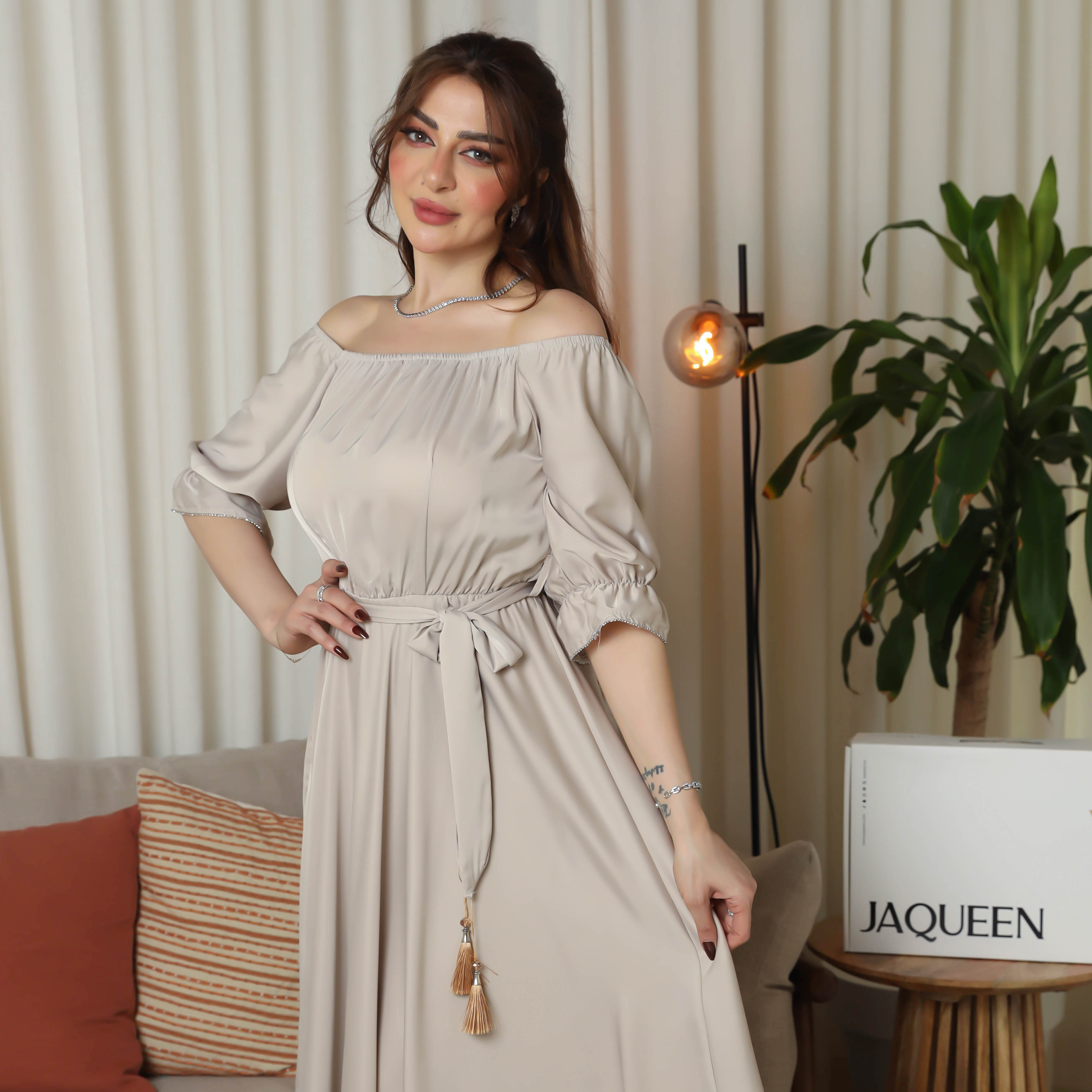 اختاري التميز مع فستان أوف شولدر باللون البيج من جاكوين، قطعة راقية تجمع بين الأنوثة والقوة مع لمسة ملكية. صُمم من قماش الساتان الناعم المعروف بلمعته الفاخرة التي تضيف بريقًا متألقًا تحت الأضواء، ليمنحك إطلالة مفعمة بالثقة والجاذبية.\n\nيتميّز الفستان بقصة أوف شولدر تكشف الأكتاف برقي، مع حزام أنيق يحدد الخصر ليبرز جمال القوام بأسلوب أنثوي ناعم. متوفر بمقاسات من S حتى XL ليلائم مختلف الأجسام ويمنحك راحة وانسيابية. ارتداؤه يجعلك تشعرين وكأنك أيقونة أنثوية تنبض بالثقة والجمال. إذا كنتِ تبحثين عن فساتين سهرة ناعمة تعكس فخامة ذوقك وتمنحك إطلالة ملكية.