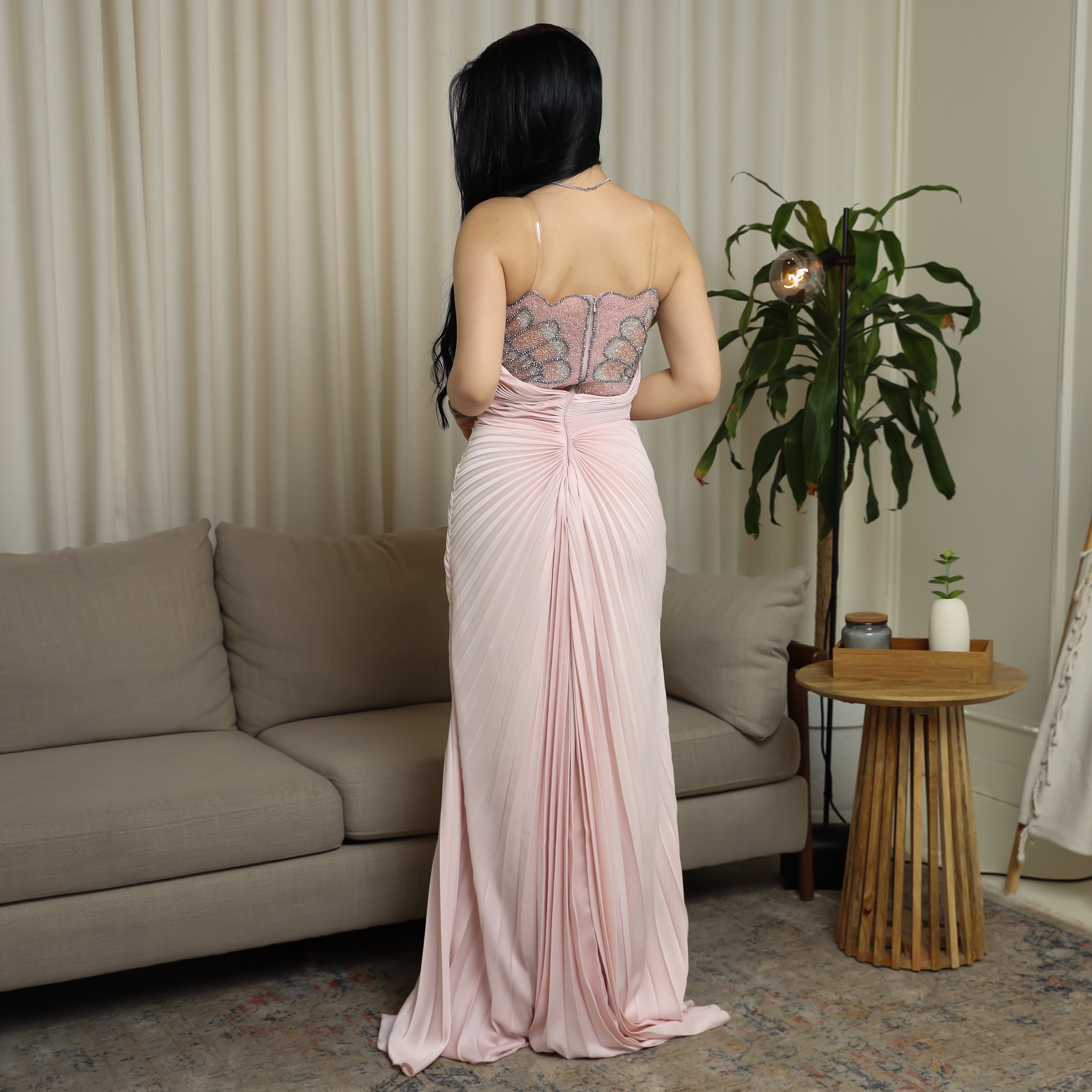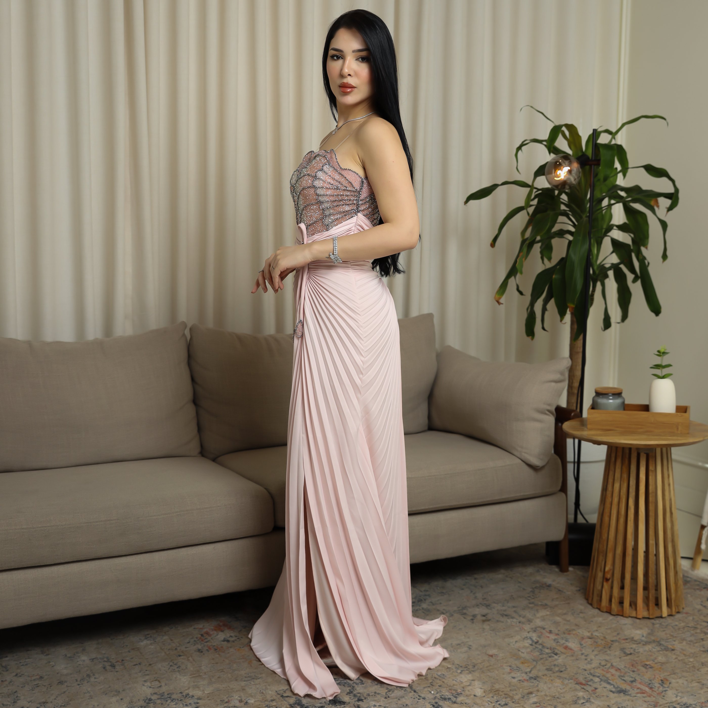 - مميزات التصميم : تصميم سترابلس يوحي بالثقة والأنوثة , تطريز فاخر بالخرز والكريستال على الجزء العلوي , قصة ضيقة مع ذيل شيفون جانبي , لون وردي ناعم يعزز الإطلالة الحالمة .