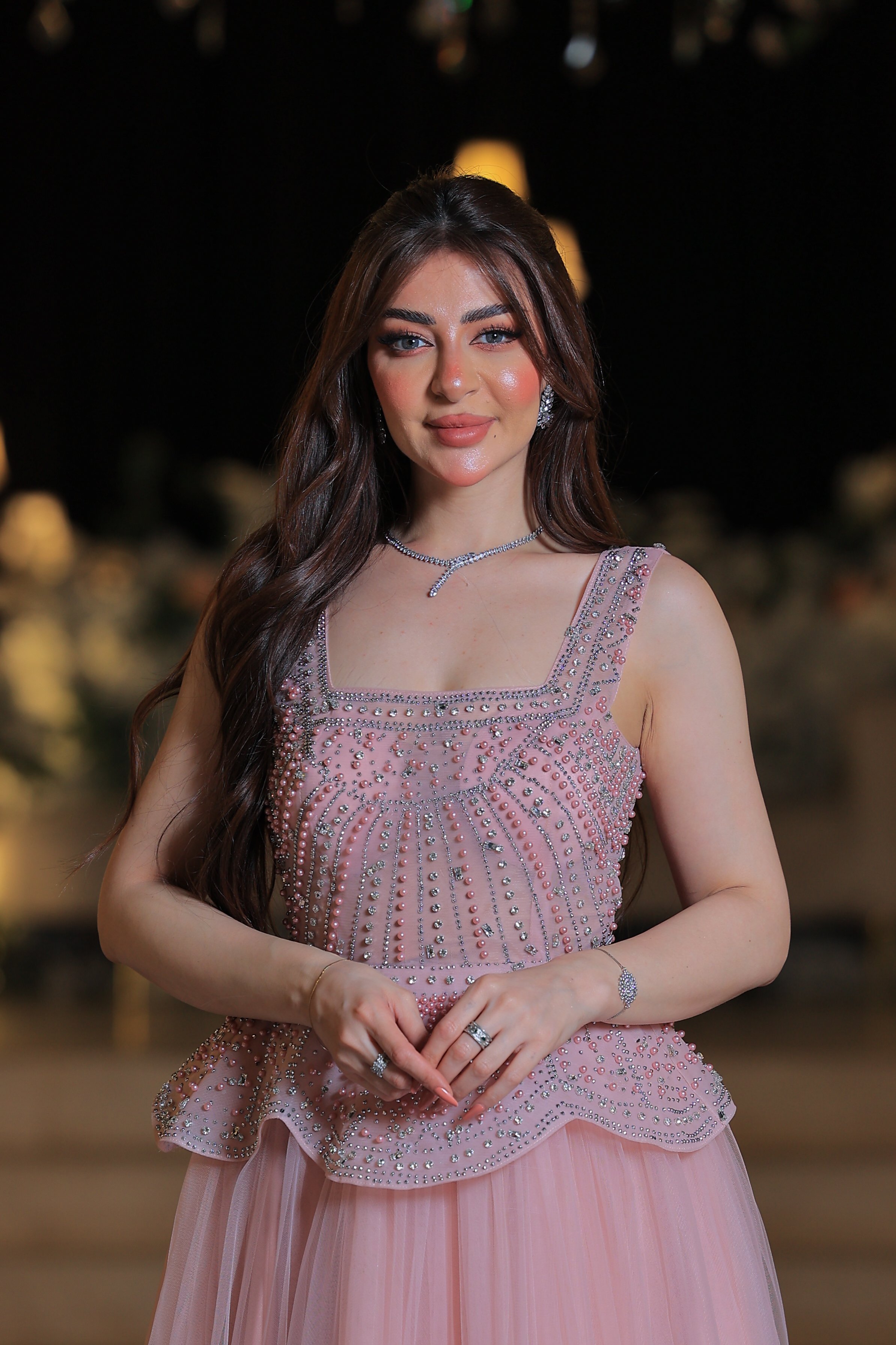- مميزات التصميم : تطريز بكريستالات لامعة", قصة خصر ملكية تبرز القوام", لون وردي ناعم يعكس الرقي .