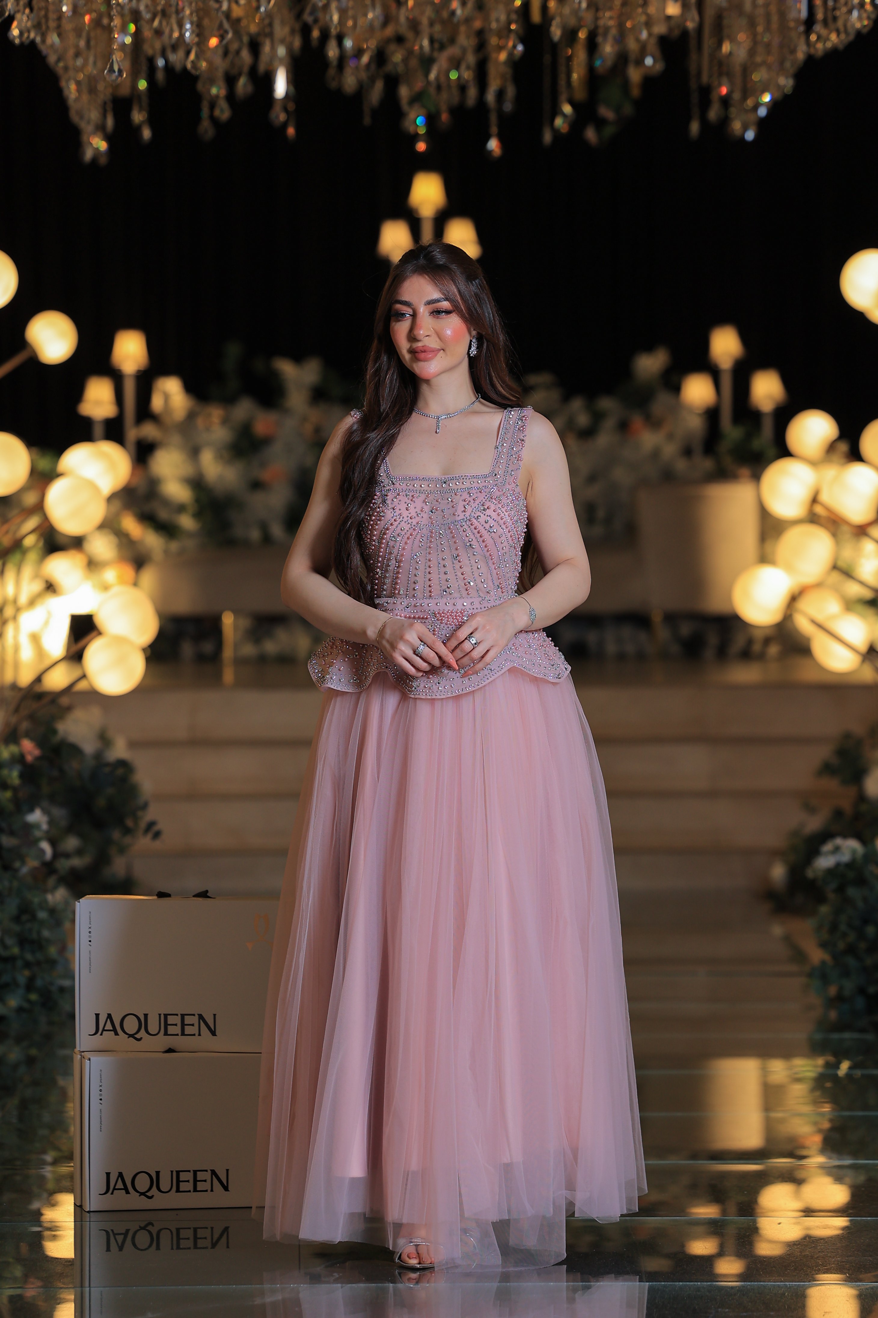 امنحي لحظاتك الخاصة لمسة من الفخامة الراقية مع هذا الفستان الوردي الملكي من جاكوين. تصميمه يجمع بين الرقة والقوة بثقة، حيث يزين الجزء العلوي تطريز فاخر بكريستالات لامعة تعكس الضوء بإشراقة ملكية تجعلك محور كل الأنظار.\n\nيأتي الفستان بقصة خصر مرتفع تبرز جمال القوام وتمنح مظهرًا ممشوقًا يعزز من أنوثتك بأناقة ناعمة. اللون الوردي الحالم يضيف لمسة رومانسية هادئة تعكس ذوقًا راقيًا وروحًا راقية مليئة بالثقة والجاذبية.