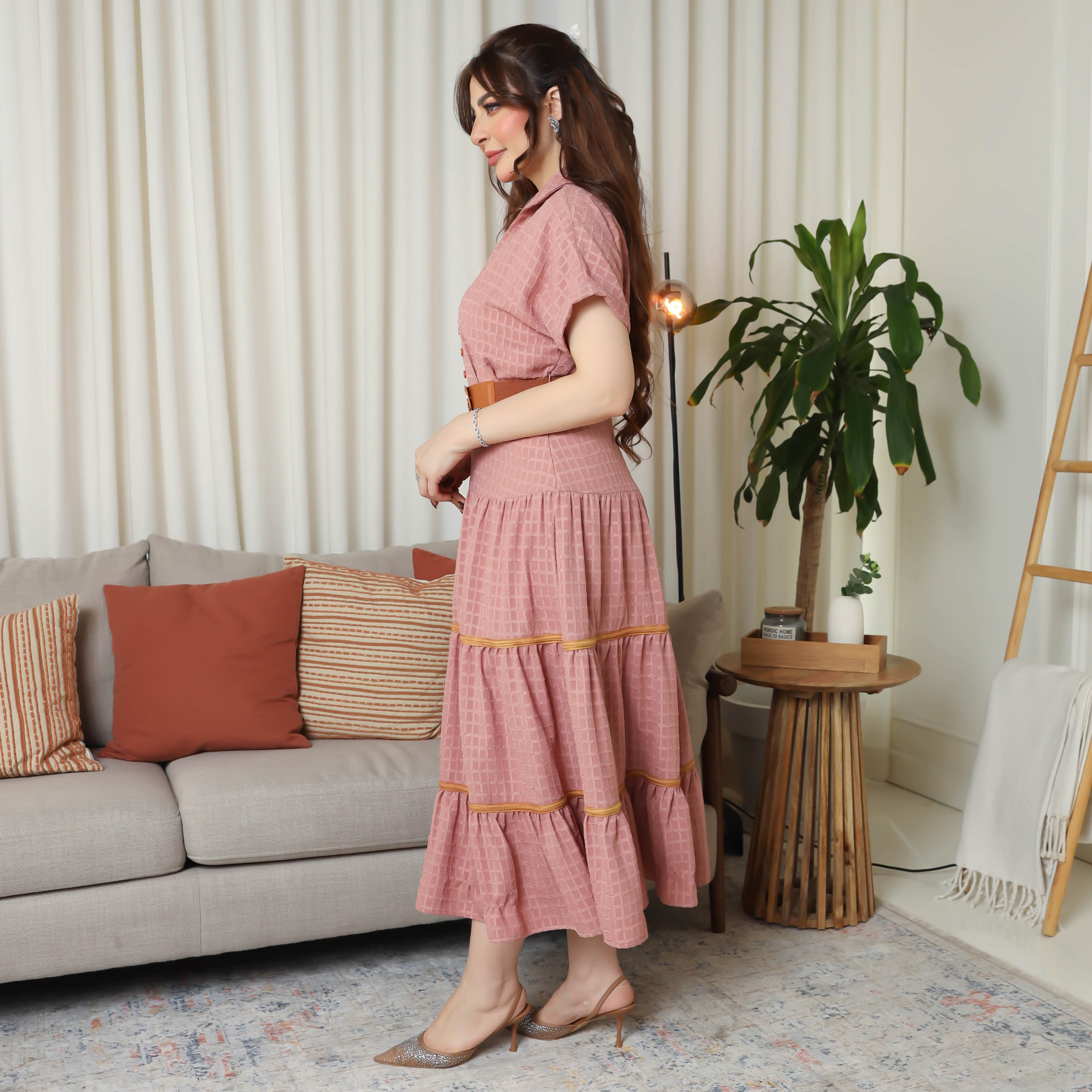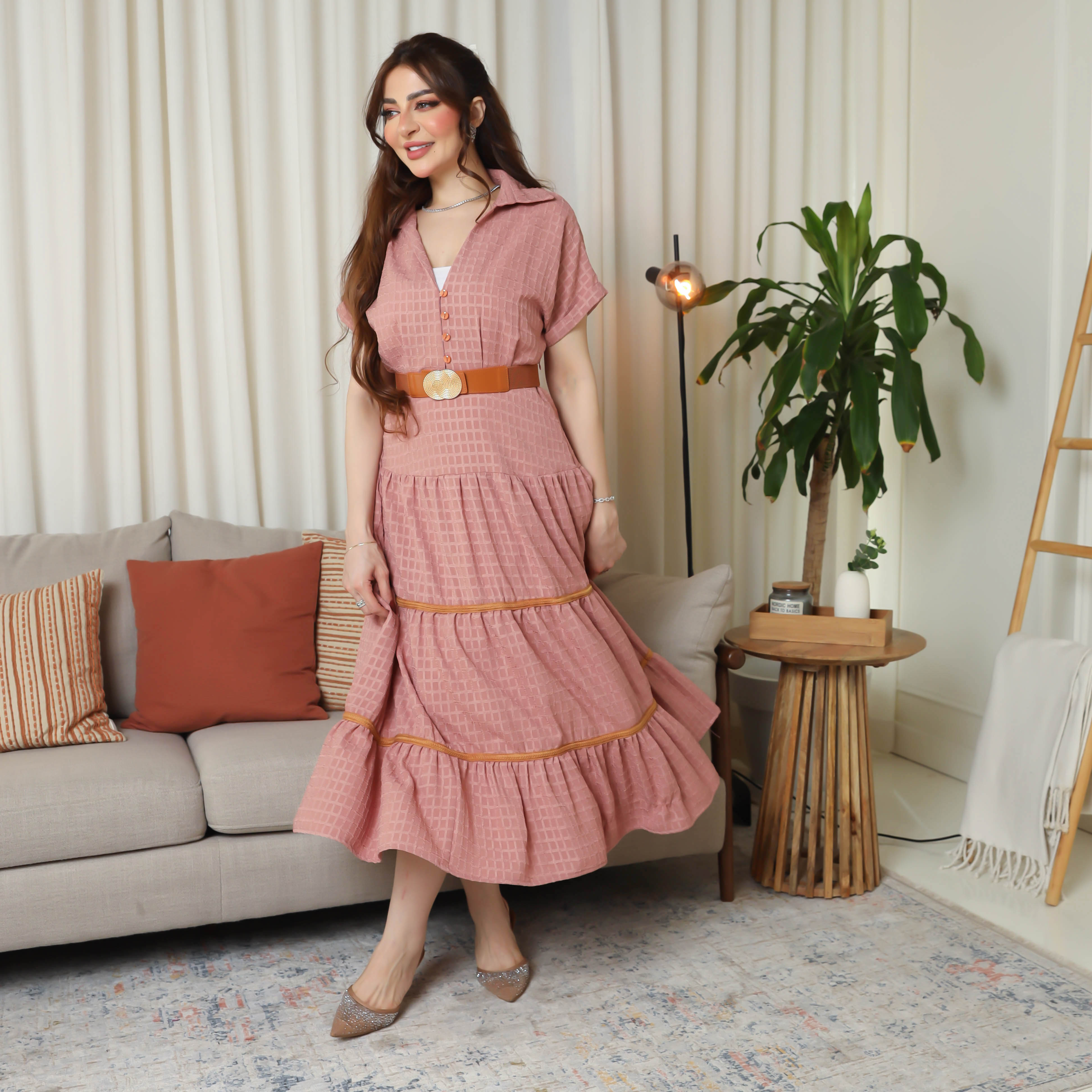 💫🌸 فستان ميدي وردي بنص كم وحزام أنيق يمنحك إطلالة صيفية مفعمة بالأنوثة 🌸💫
