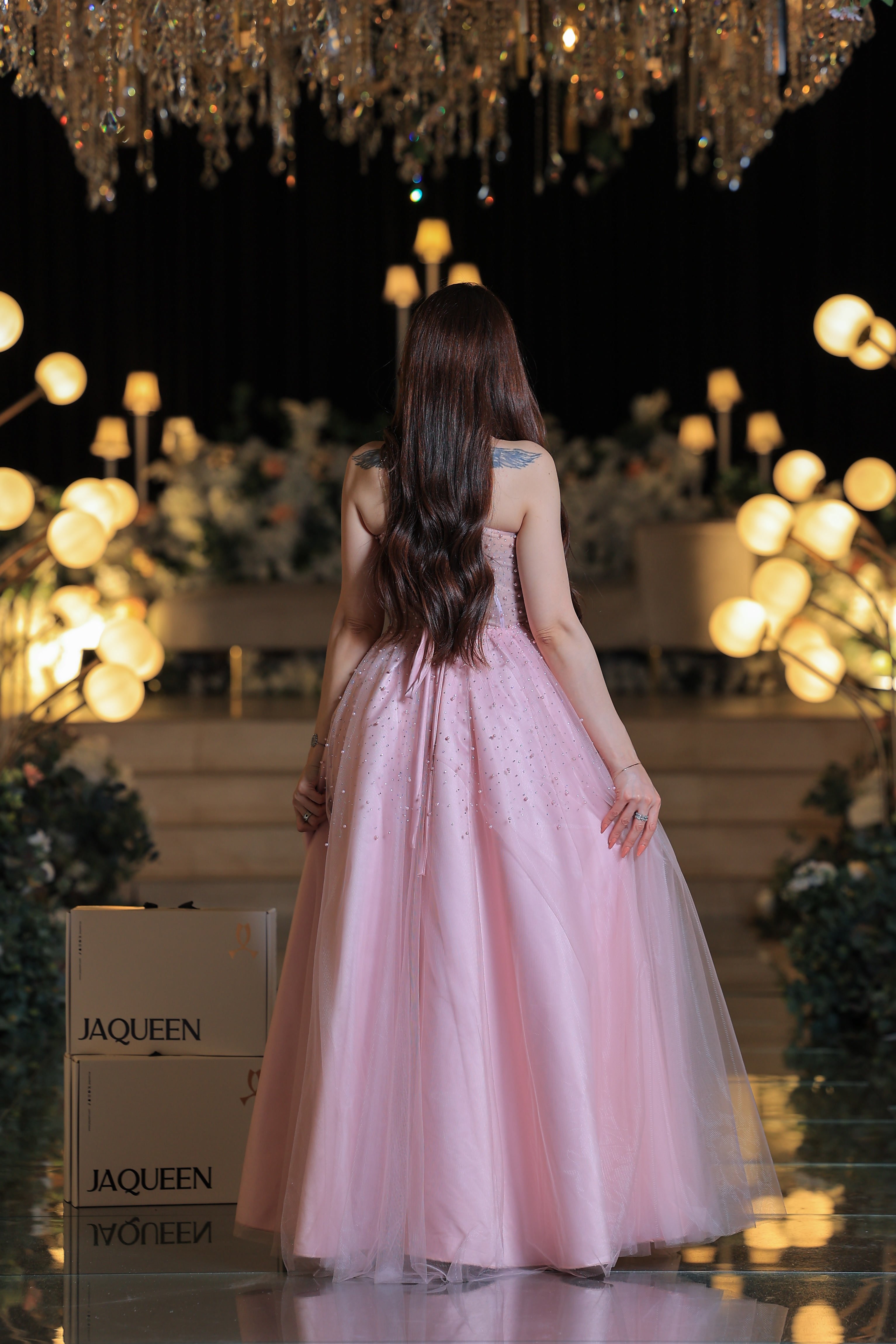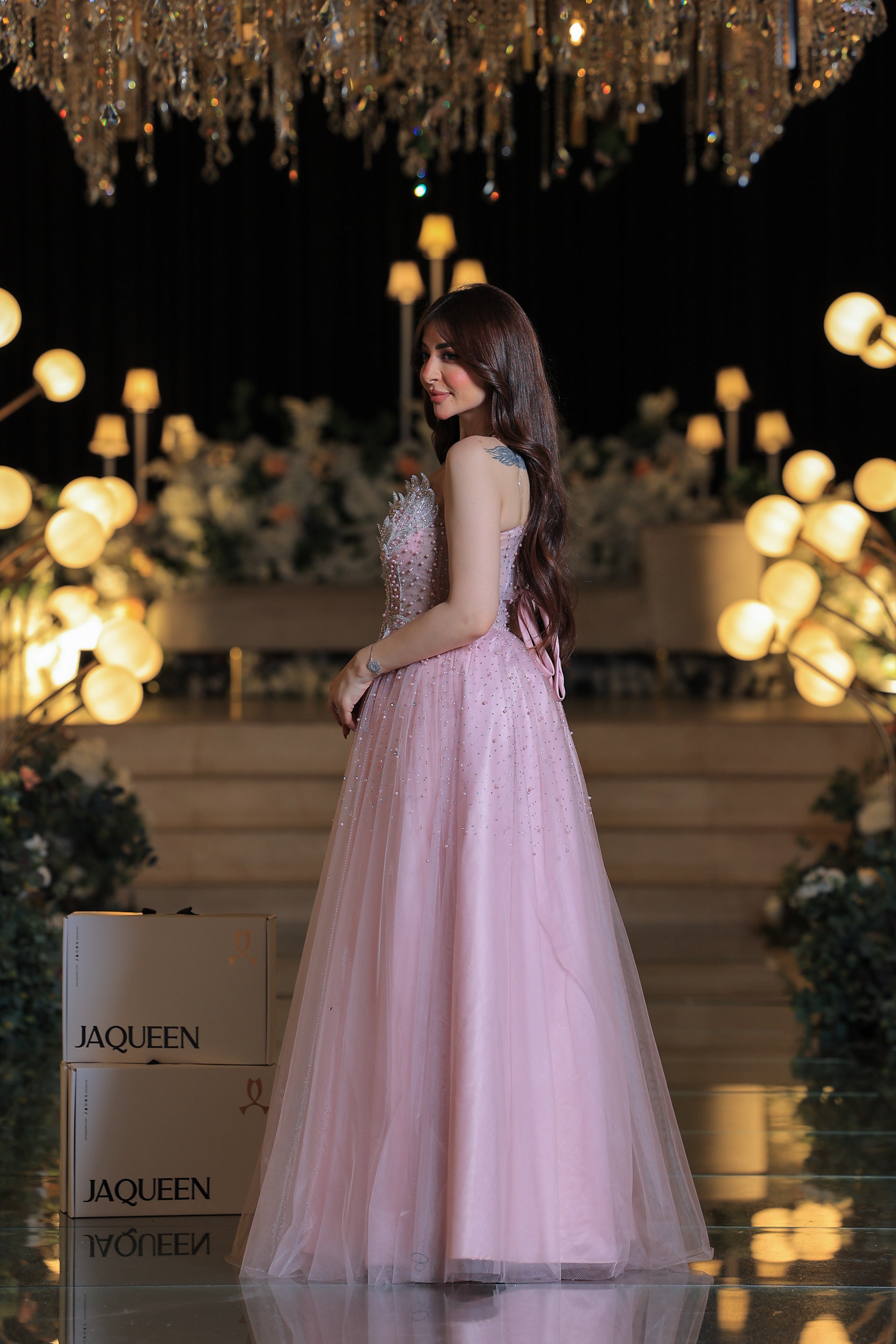ارتدي الفخامة بكل تفاصيلها مع هذا الفستان الوردي الملكي من جاكوين، المصمم ليجمع بين الرقة الملكية واللمسة العصرية الراقية. يأتي الفستان بتطريز فاخر من اللؤلؤ والكريستال المتناثر على القماش بطريقة فنية تعكس الضوء وتمنحك وهجًا ساحرًا يلفت الأنظار في كل لحظة.\n\nخامة التل المطرز تضيف إحساسًا بالنعومة والانسيابية، في حين يمنح اللون الوردي الناعم توازنًا مثاليًا بين الأنوثة والرقي. هذا الفستان ليس مجرد قطعة ملابس، بل هو تجربة تبرز ثقتك، حضورك، وذوقك الملكي الرفيع