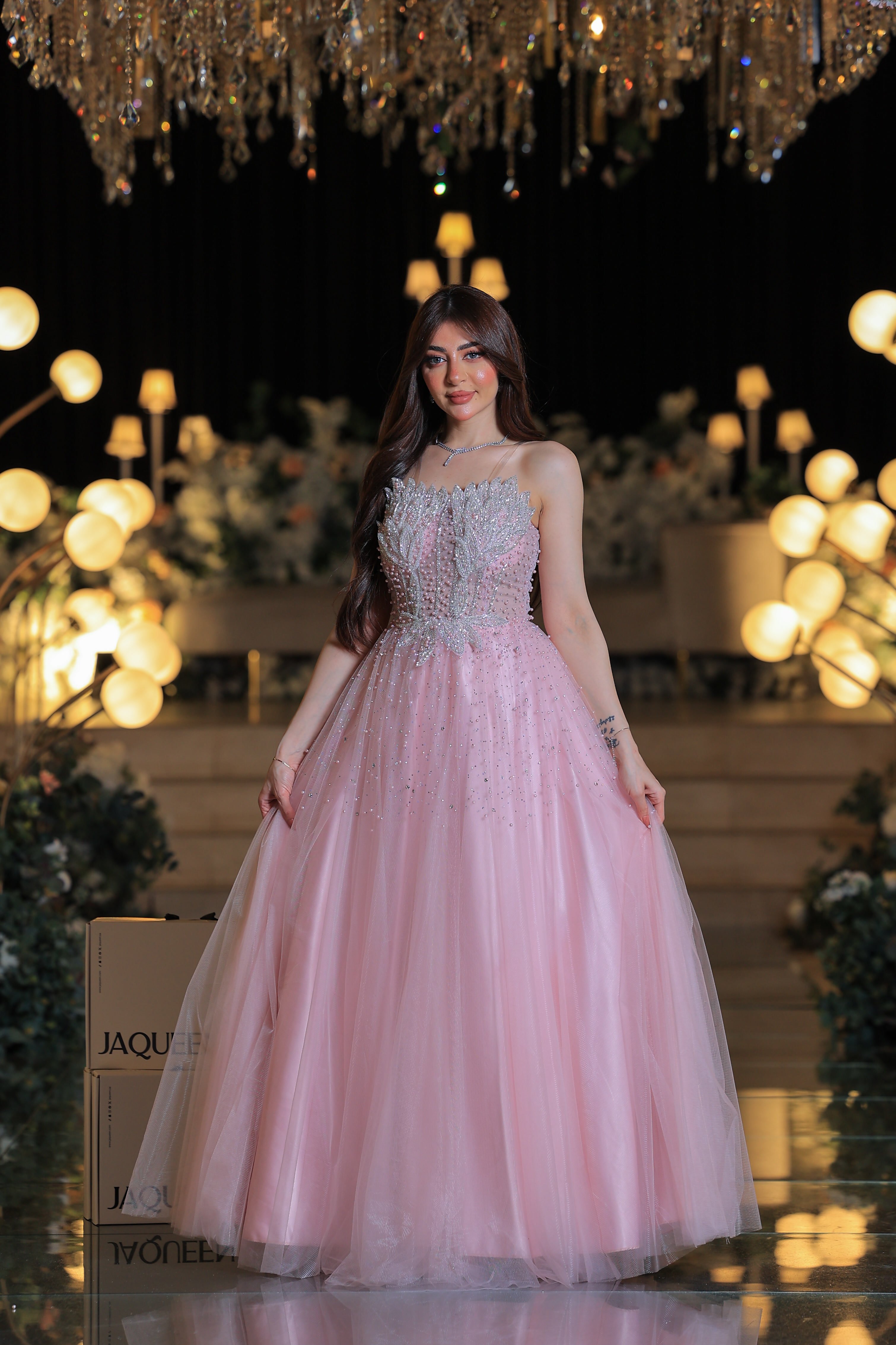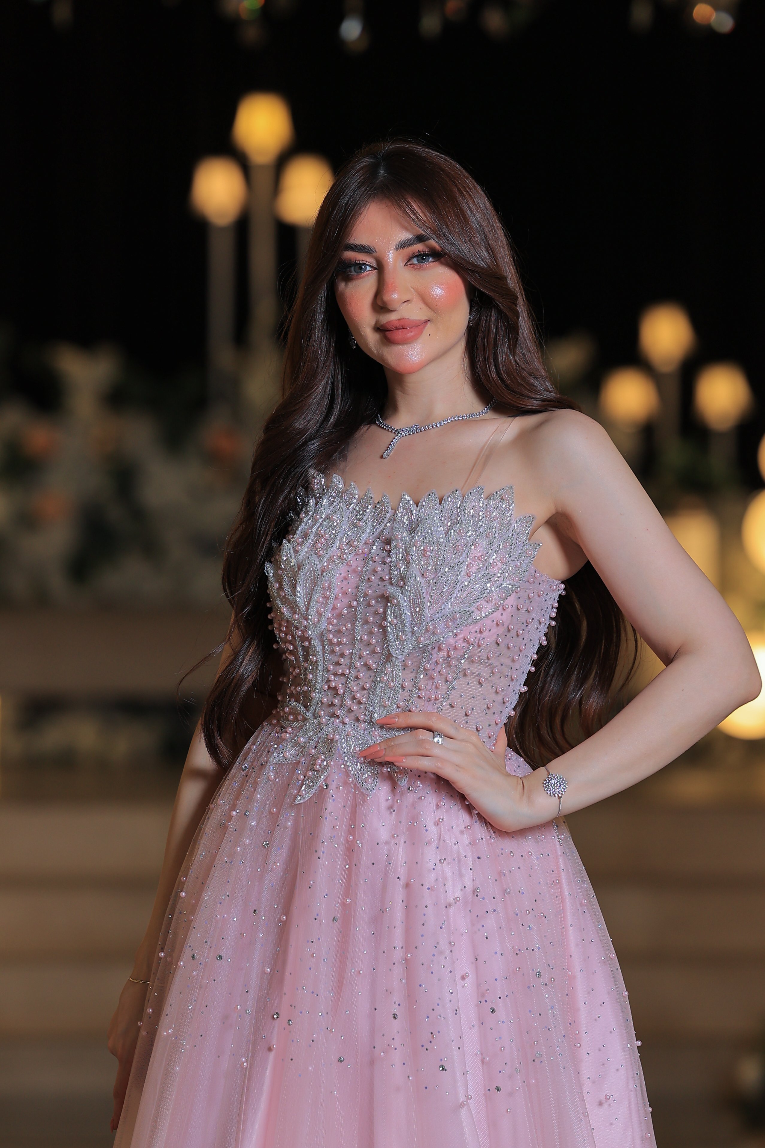 - مميزات التصميم : تطريز فاخر باللؤلؤ والكريستال , لون وردي ناعم يعكس الأنوثة والرقي , قصة ملكية تبرز جمال القوام .