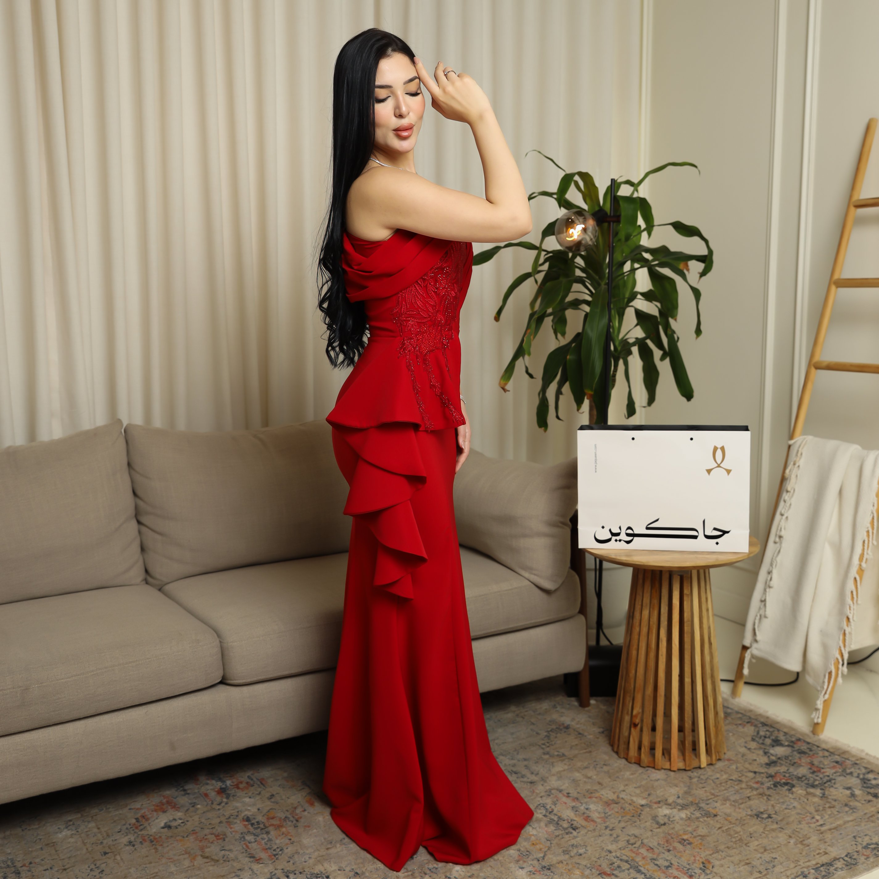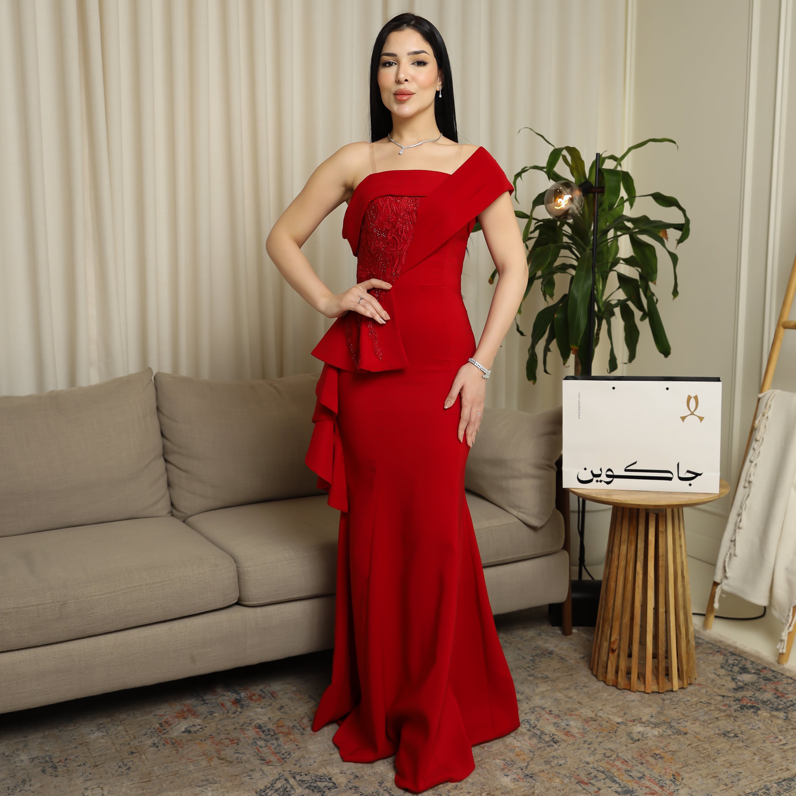 امنحي نفسك حضورًا ملكيًا مع فستان أحمر ملكي بكتف ساقط من جاكوين، حيث يلتقي اللون الأحمر الجريء مع التصميم الراقي ليجسد الأنوثة والثقة. صُنع من قماش كريب باربي فاخر بنعومة عالية تمنحك الراحة وتدوم بأناقة طوال السهرة.\n\nتفاصيل التطريز الفاخر على الكتف والخصر تضيف لمسة ملكية متقنة، بينما يوازن التصميم الكاشف للكتف مع كم واحد بين الأناقة والأنوثة الجذابة. القصة المستقيمة مع الفتحة الأمامية تمنحك انسيابية مبهرة وتبرز الطول برشاقة، مع إغلاق خلفي أنيق لضبط المقاس بشكل مثالي.\n\nمتوفر بمقاسات من 8 حتى 18 .