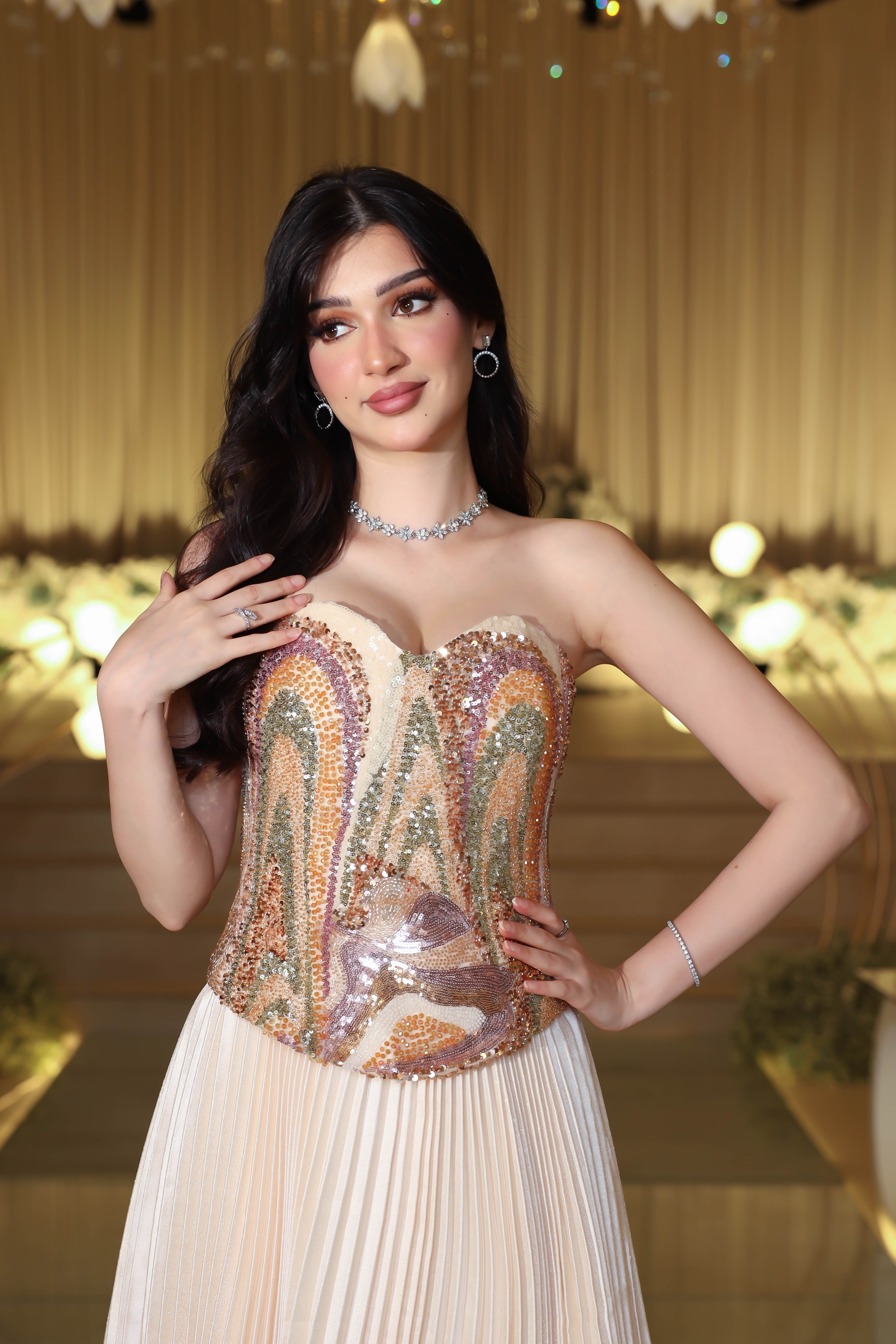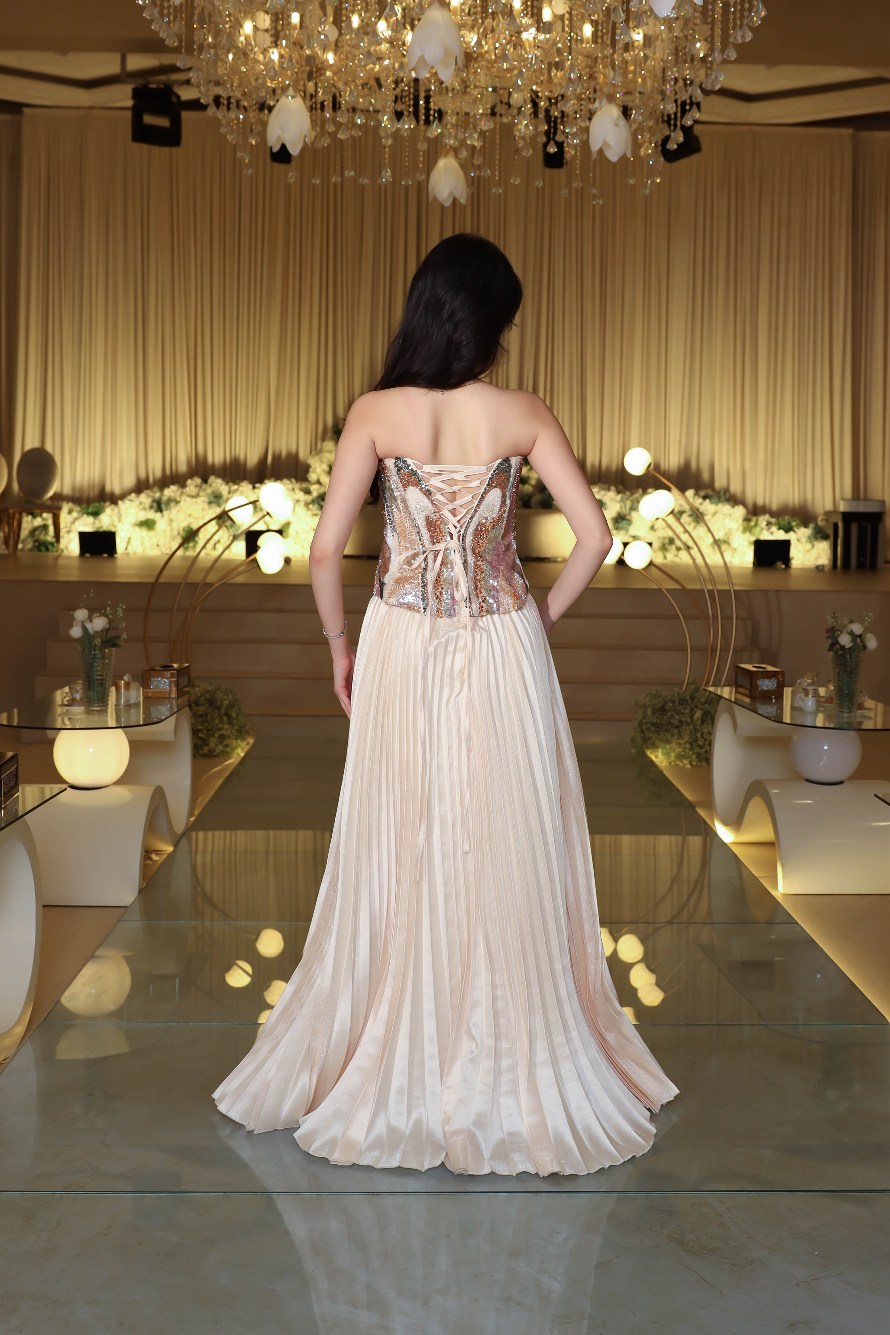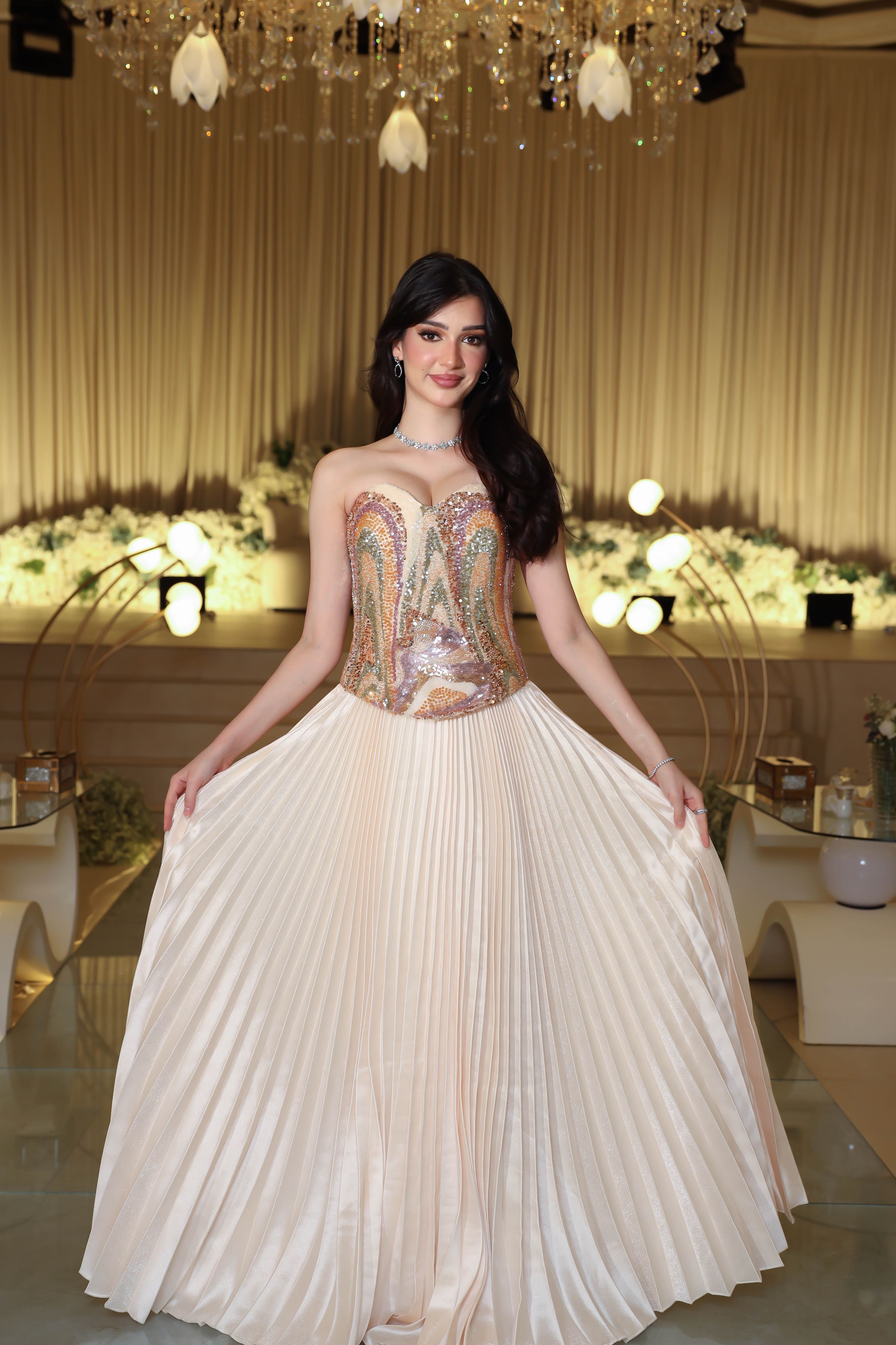 - مميزات التصميم : كورسيه مطرز بالكامل بتصميم هندسي فاخر , قصة خصر محدد لإبراز القوام الأنثوي , قصة بليسيه تمنح الفستان انسيابية ملكية , بدون أكمام لإطلالة عصرية أنيقة .