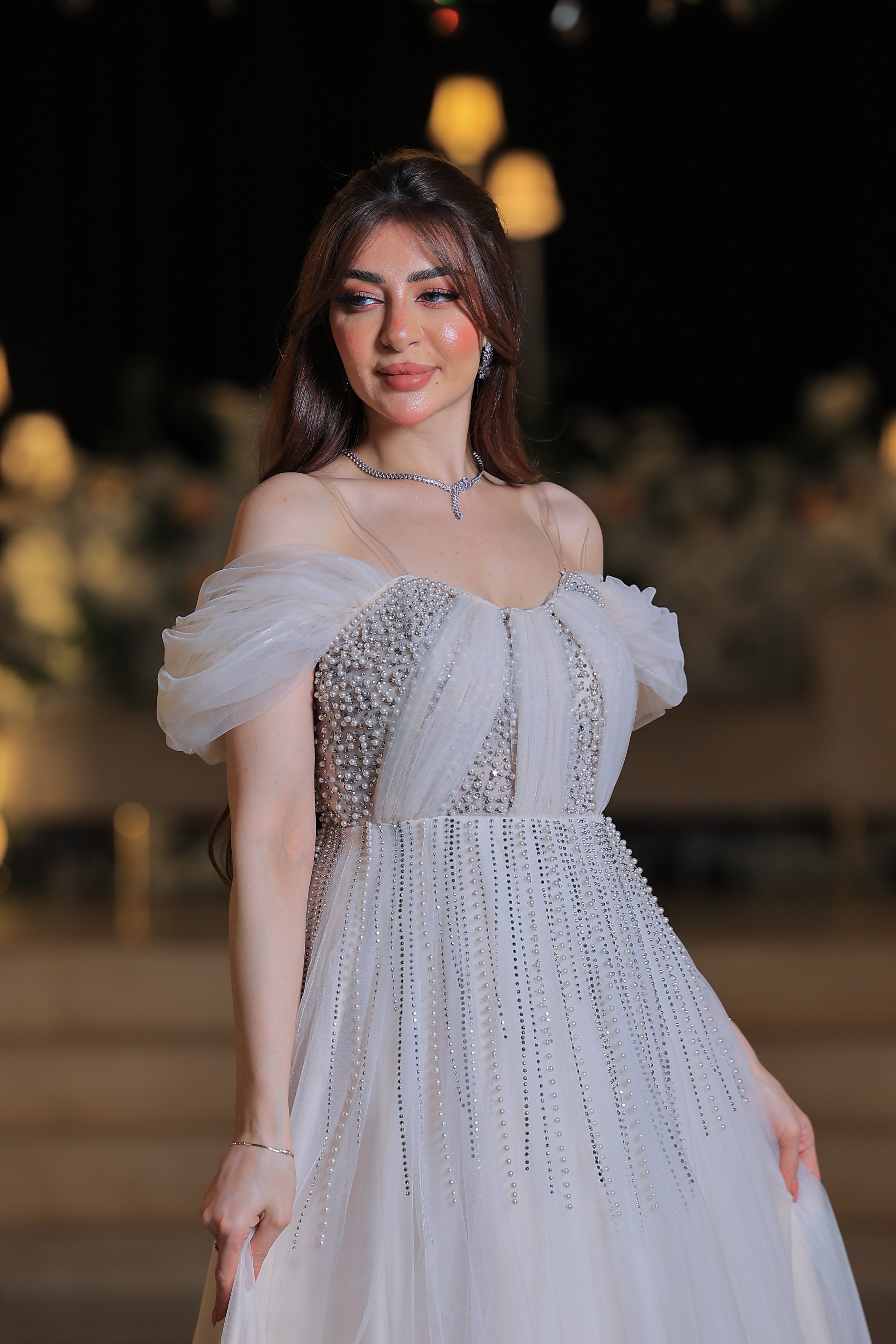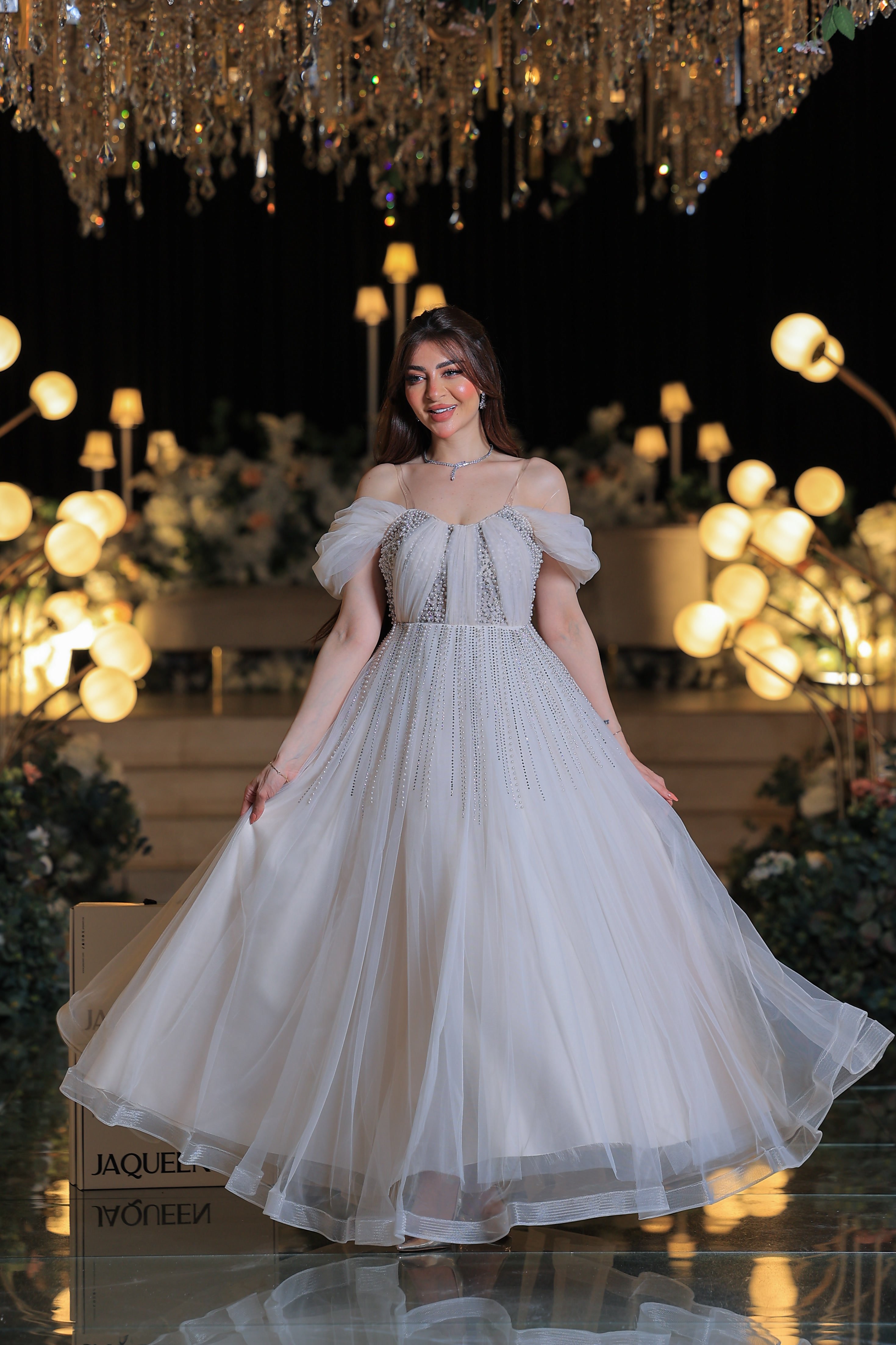 💫🌸 فستان تول ملكي بتطريز فضي ولمسة أوف شولدر تحوّل كل لحظة إلى إطلالة استثنائية لا تُنسى 🌸💫