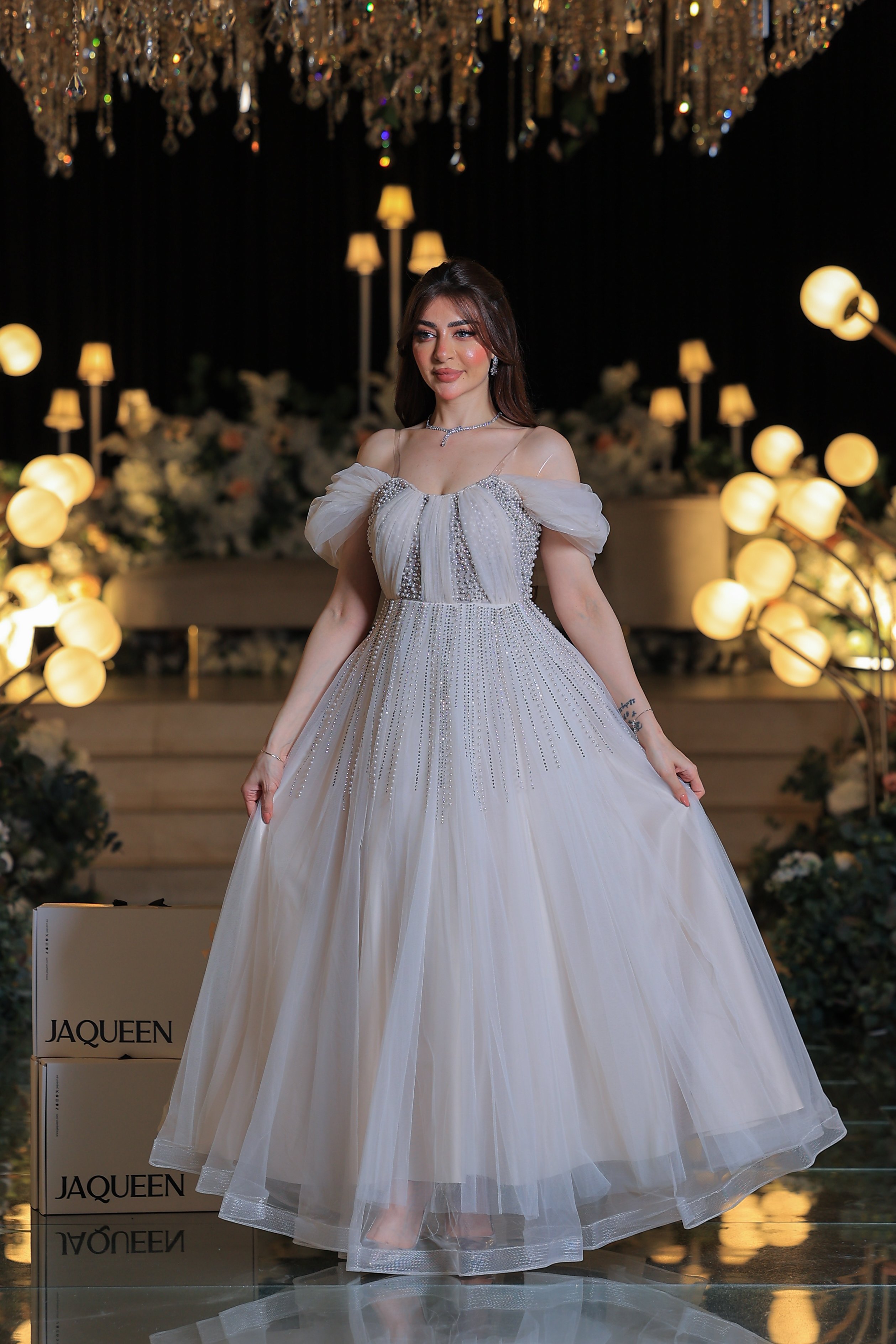 استمتعي بتجربة فريدة تجمع بين الأنوثة الحالمة والفخامة الراقية مع فستان تول ناعم مطرز بترتر فضي من جاكوين. صُمم هذا الفستان ليكون تحفة فنية تمنحك حضورًا متألقًا يلفت الأنظار من اللحظة الأولى. يتميز الفستان بقماش التول الفاخر الذي ينسدل برقة ليعزز جمال الحركة، مع تطريز ترتر فضي يعكس الضوء بلمعان راقٍ يعبر عن الفخامة الملكية. تأتي الأكمام بتصميم أوف شولدر منفوخ يمنح الإطلالة لمسة ساحرة تجمع بين الجرأة والرقي، بينما تضفي القصة الواسعة لمسة خيالية تجعلك تشعرين وكأنك تعيشين داخل قصة ملكية.
