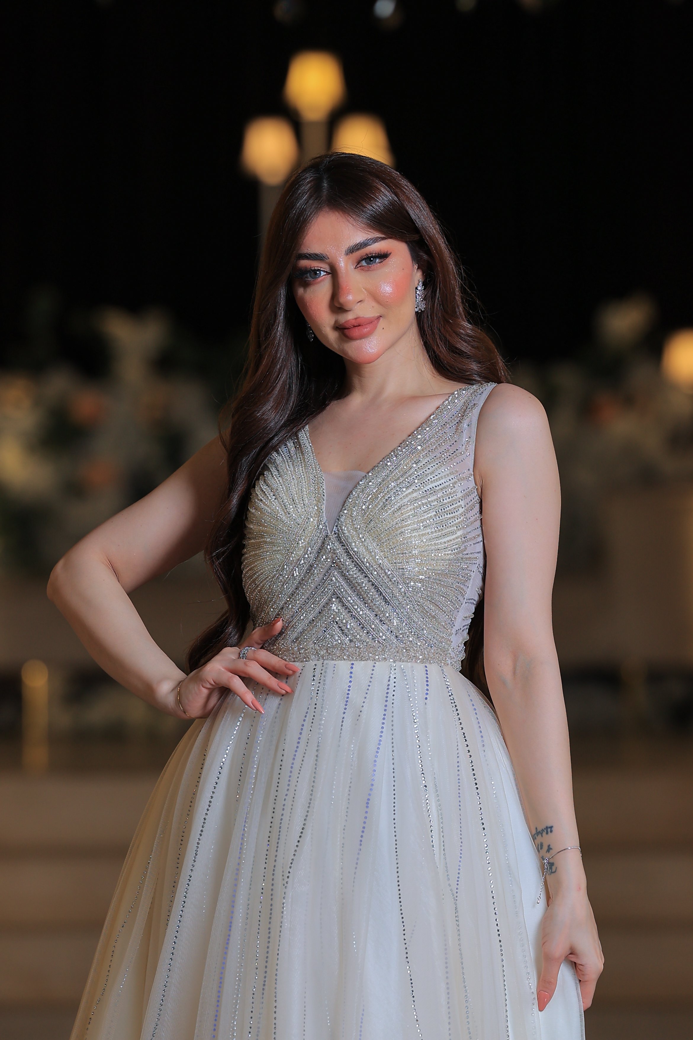 - مميزات التصميم : تطريزات لامعة بخيوط ماسية أنيقة , قصة أنثوية انسيابية تبرز جمال الجسم , قماش مريح وخفيف مناسب للسهرات الطويلة .