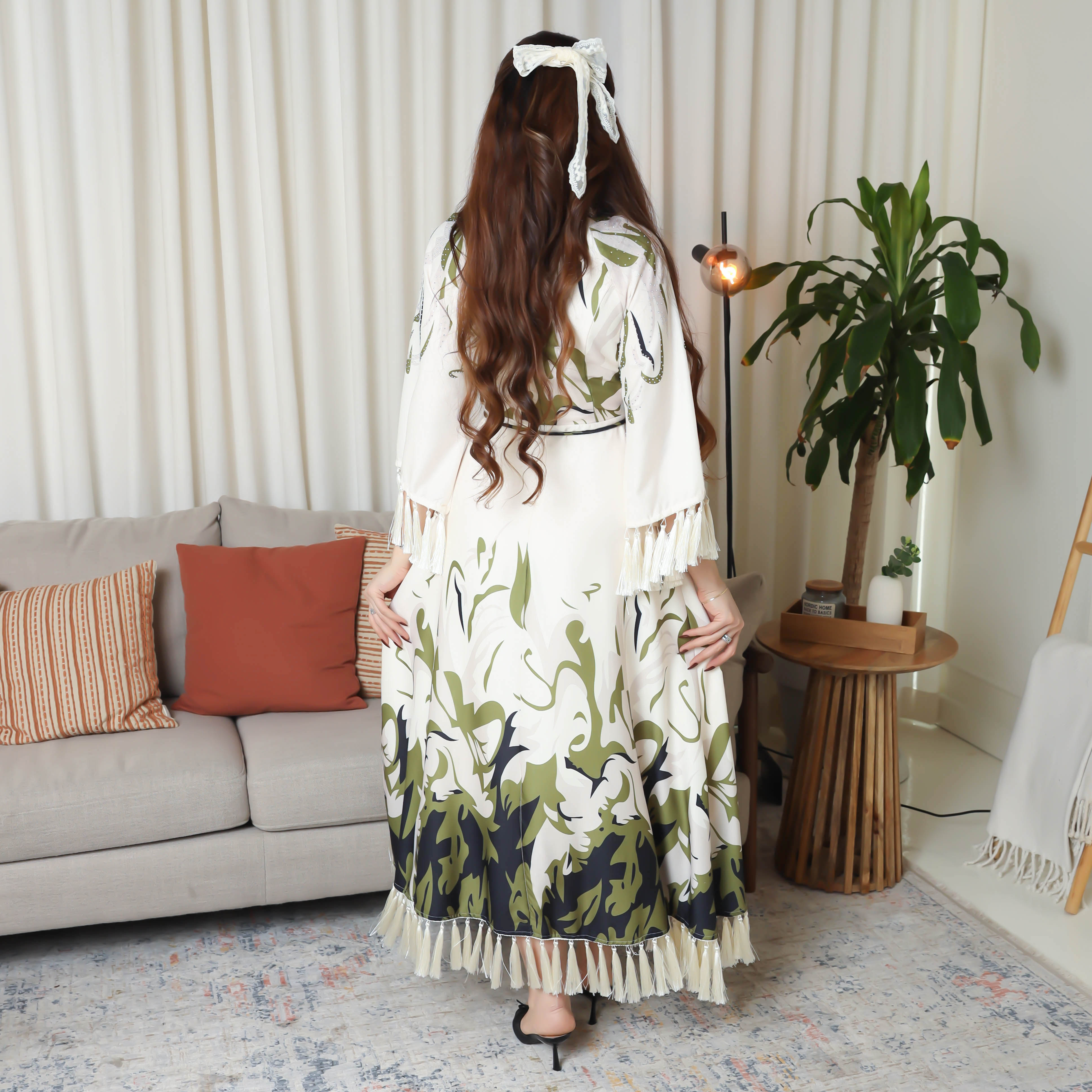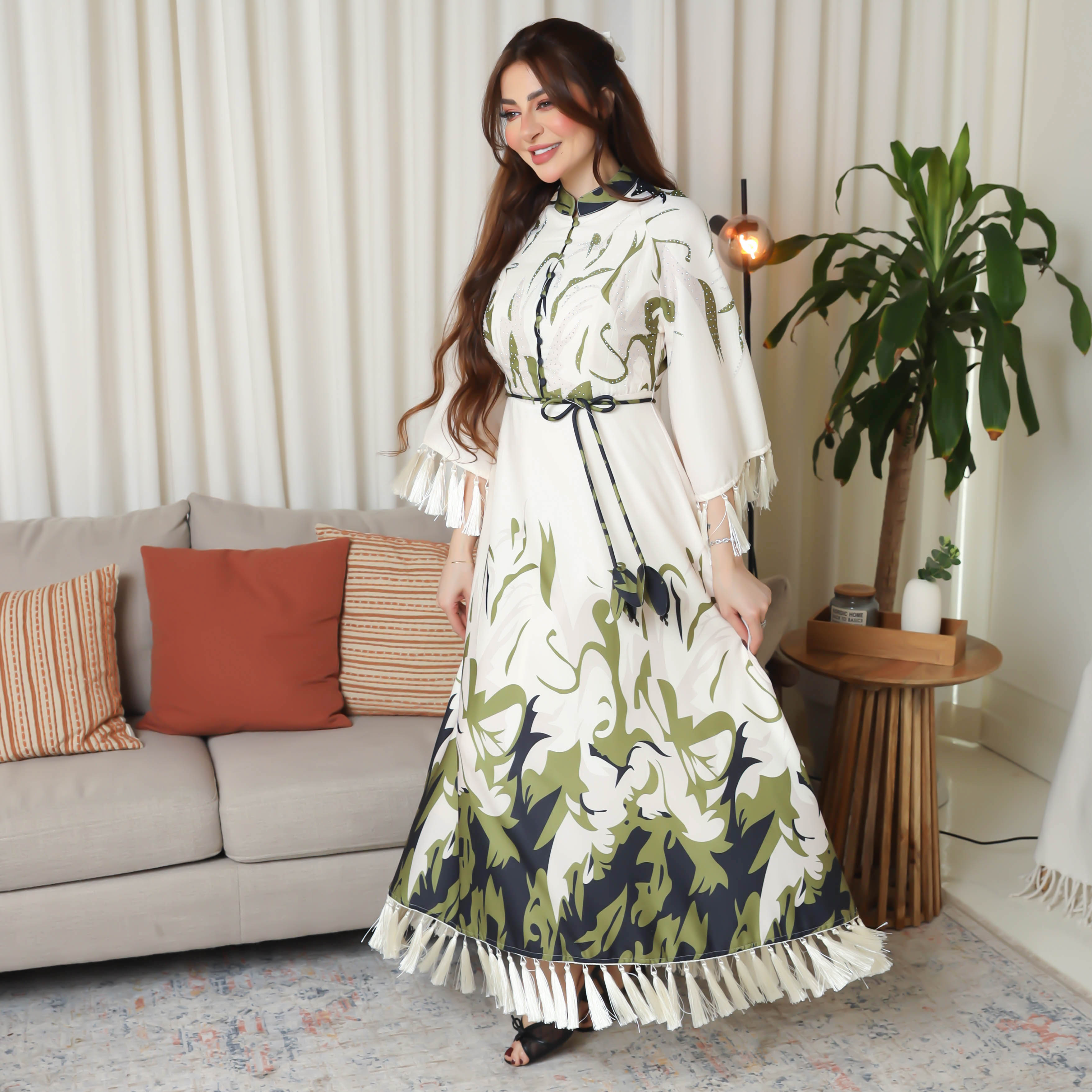 - مميزات التصميم : نقشة مشجرة بألوان أنيقة, حزام على الخصر لإبراز القوام .