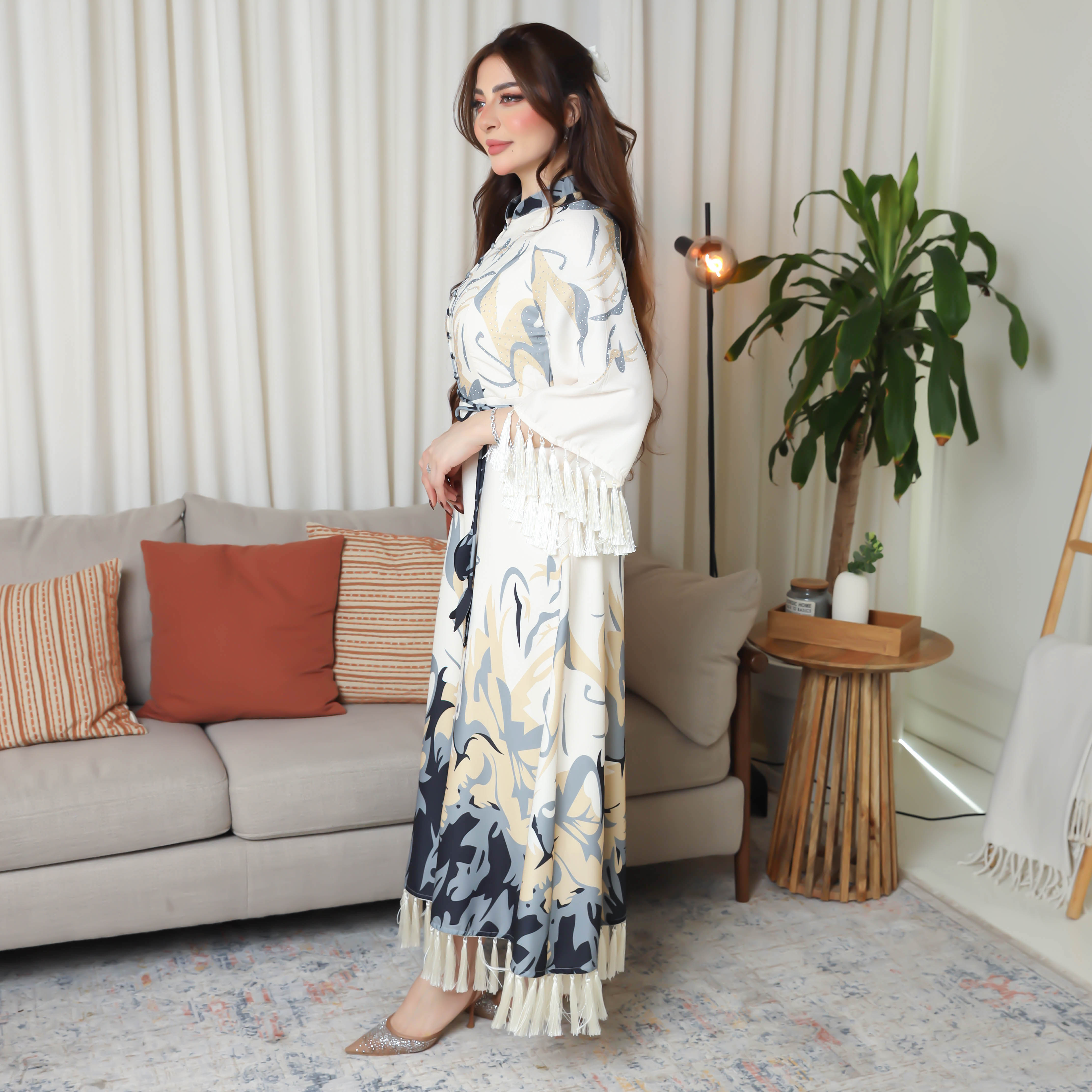 - مميزات التصميم : نقشة مشجرة بألوان أنيقة, حزام على الخصر لإبراز القوام .