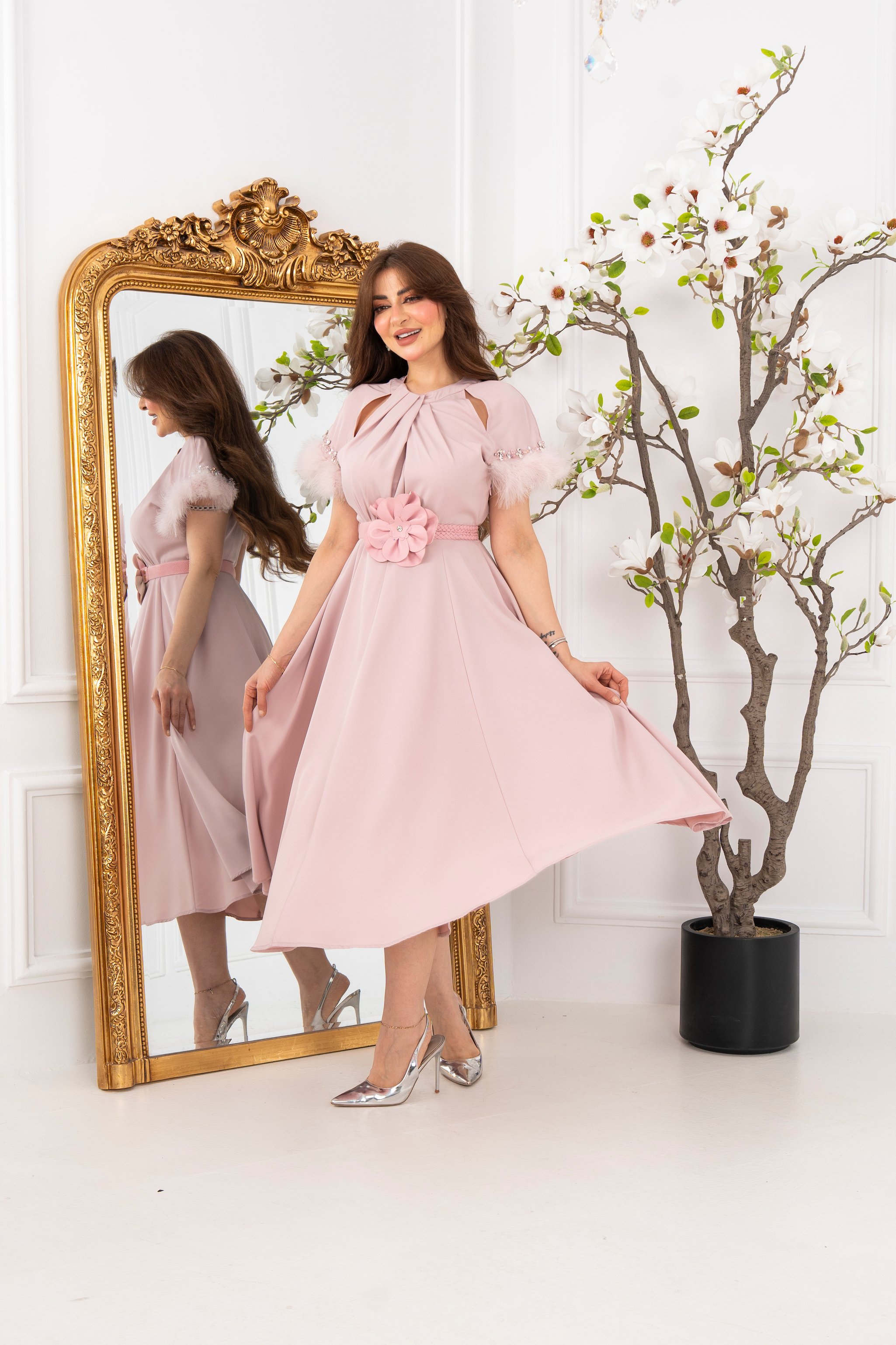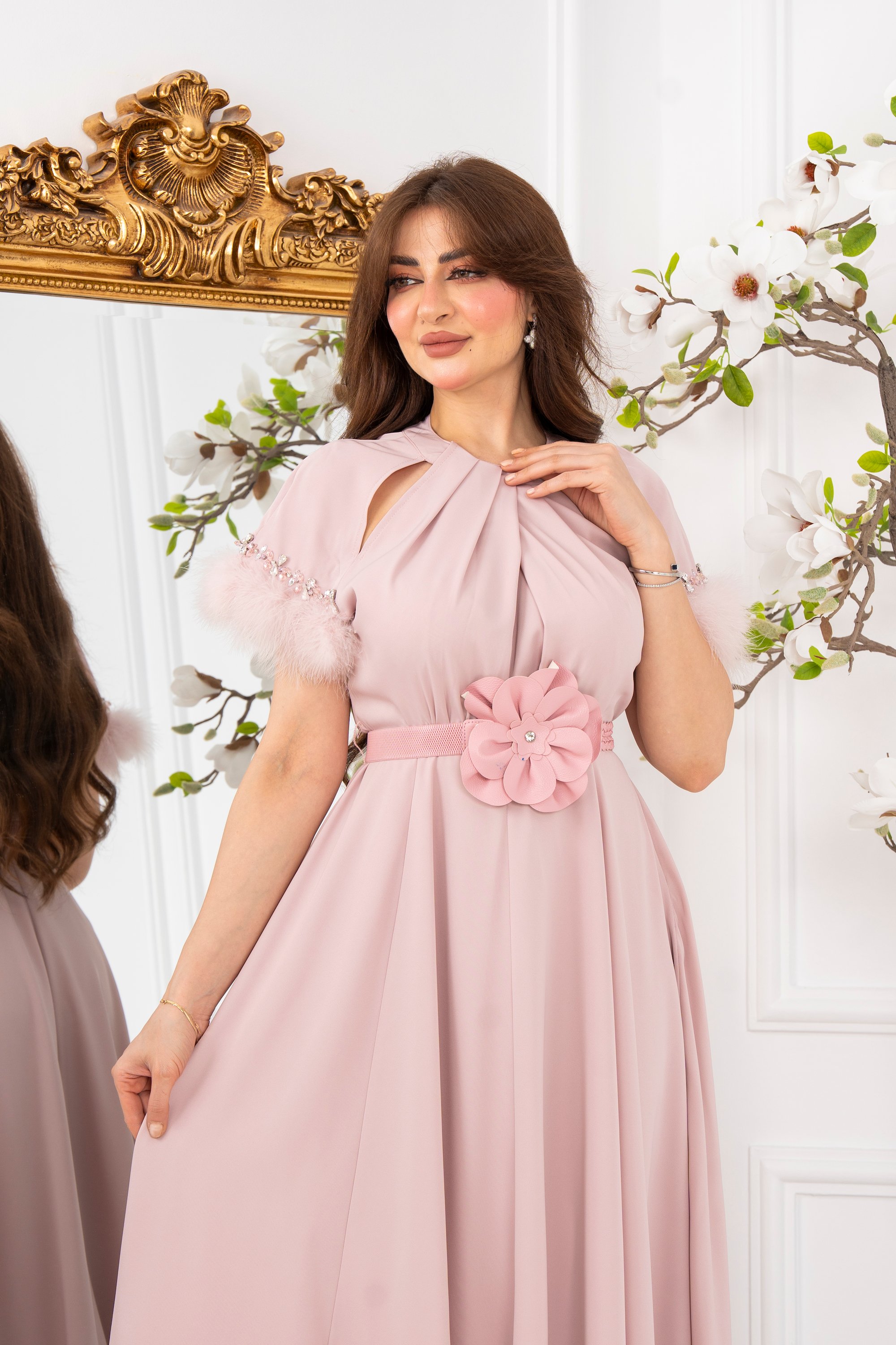 💫🌸 اجعلي لحظاتك تفيض بالرقي مع فستان وردي بكم ريش من متجر فساتين سهرة جاكوين 🌸💫