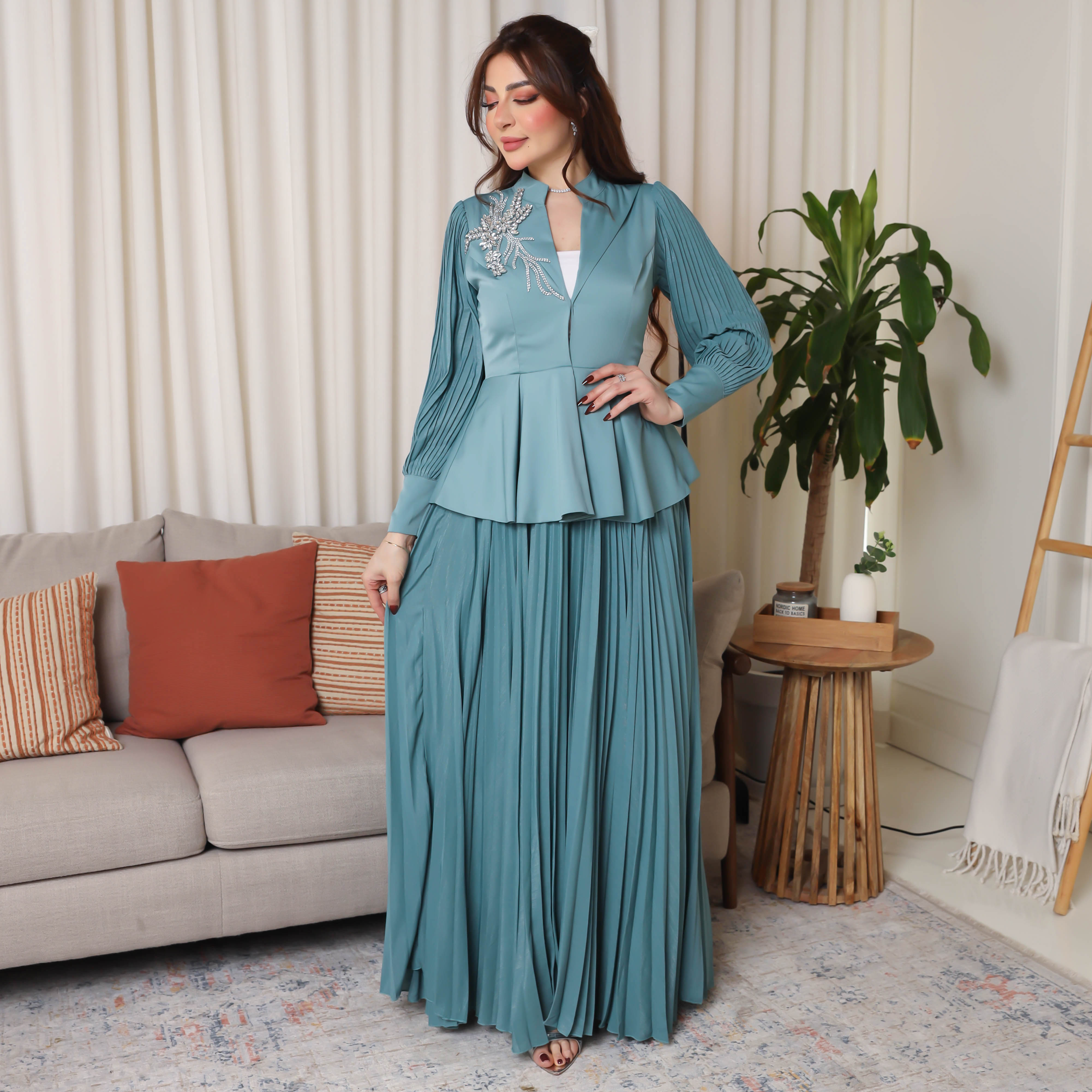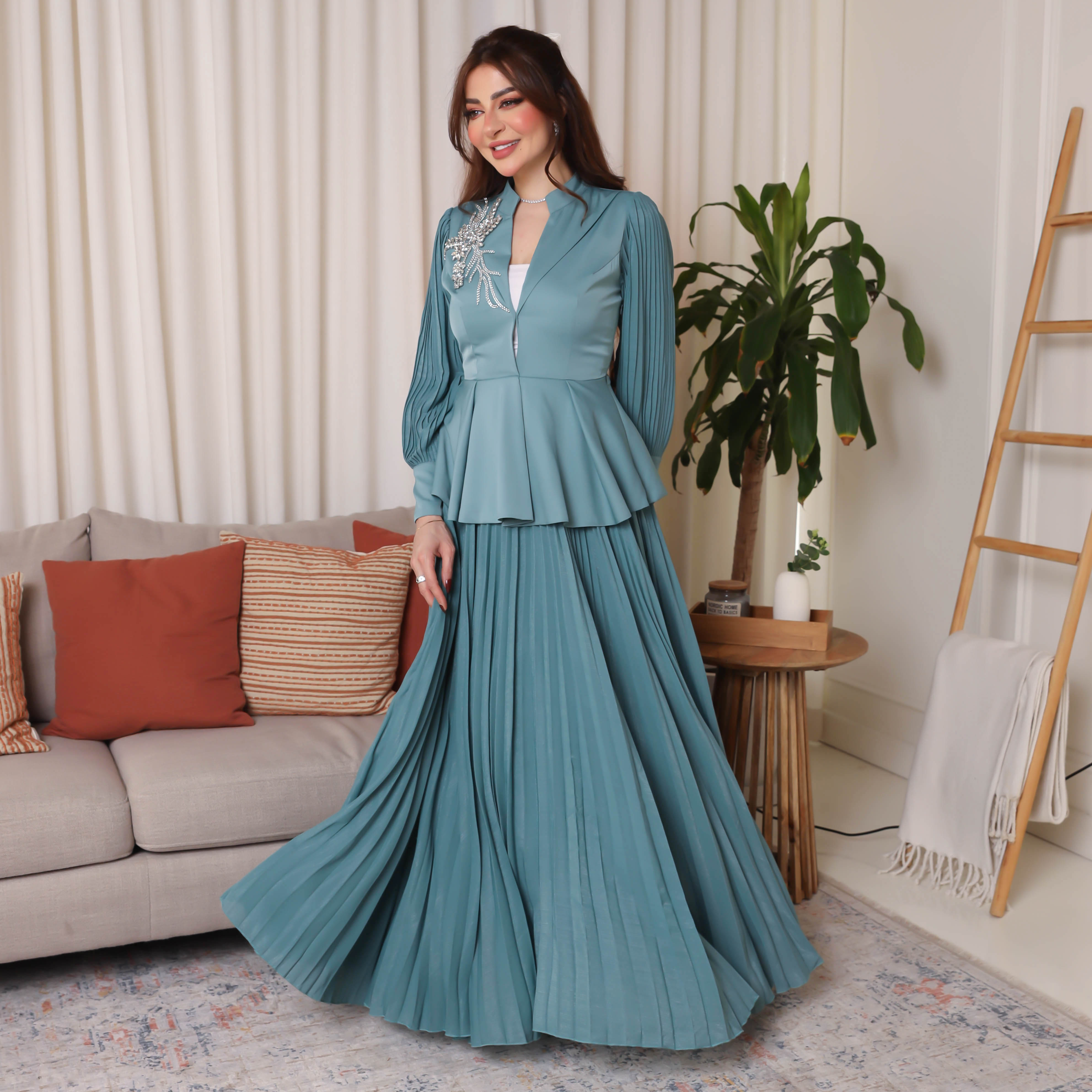 اختبري سحر الأناقة الكلاسيكية مع فستان سادة طويل باللون التيفاني من جاكوين. صُمم بخامة الشيفون الفاخرة التي تضفي لمعة راقية وانسيابية حالمة، وجُمل بفصوص أنيقة على الكتف تعكس الفخامة، مع قصة بليسية تزيد من جاذبية التصميم وتمنحك إطلالة عصرية متفردة. متوفر بمقاسات من S إلى XL ليمنح كل امرأة قصّة تتناغم مع قوامها وتبرز جمالها الأنثوي. ارتداؤه يجعلك تشعرين بأنوثة قوية وأناقة خالدة لا تنسى، فهو ليس مجرد قطعة ملابس بل تجربة فاخرة تجسد ذوقك الرفيع.